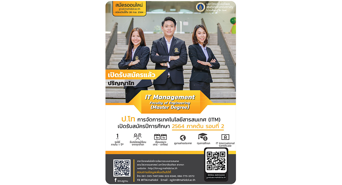 มิติหุ้น – ผศ.ดร. สุภาภรณ์ เกียรติสิน หัวหน้ากลุ่มสาขาวิชาเทคโนโลยีการจัดการระบบสารสนเทศ คณะวิศวกรรมศาสตร์ มหาวิทยาลัยมหิดล กล่าวว่า เราอยู่ในโลกที่มีข้อมูลข่าวสารมหาศาล ซึ่งการจัดการข้อมูลสารสนเทศเพื่อนำมาใช้ประโยชน์และสร้างความสำเร็จเป็นสิ่งสำคัญยิ่ง โดยเฉพาะเศรษฐกิจดิจิทัลและการเปลี่ยนผ่านขององค์กร ทั้งภาคเอกชนและภาครัฐต่างต้องการทรัพยากรมนุษย์ด้านการจัดการเทคโนโลยีสารสนเทศ (ITM) ที่มีคุณภาพ ความคิดสร้างสรรค์ และวิสัยทัศน์ โดยหลักสูตร ป.โท การจัดการเทคโนโลยีสารสนเทศนี้ ผู้เรียนจะได้รับทักษะและความรู้การบริหารจัดการข้อมูล E-Thailand และงานบริการวิชาการที่เน้นหนักไปในด้าน E-Society เพื่อคุณภาพชีวิตของคนไทย วิชาที่ได้เรียน ได้แก่ การจัดการระบบสื่อสารยุคใหม่และเครือข่ายคอมพิวเตอร์, อุตสาหกรรมอัจฉริยะและเทคโนโลยีอัจฉริยะ, พฤติกรรมองค์กรและการพัฒนาองค์กรในยุคดิจิทัล, การจัดการทรัพยากรมนุษย์เชิงกลยุทธ์และภาวะผู้นำในยุคดิจิทัล, การจัดการสารสนเทศทางโลจิสติกส์และโซ่อุปทาน, มาตรฐานเทคโนโลยีสารสนเทศระดับสากล เป็นต้น นับเป็นโอกาสใหม่ในการเพิ่มศักยภาพตนเอง เหมาะสำหรับคนทำงาน ผู้บริหารที่ต้องการเรียนรู้สิ่งใหม่ ไอทีเทคนิเชี่ยน และผู้ที่สนใจที่จะก้าวไกลในโลกไอที