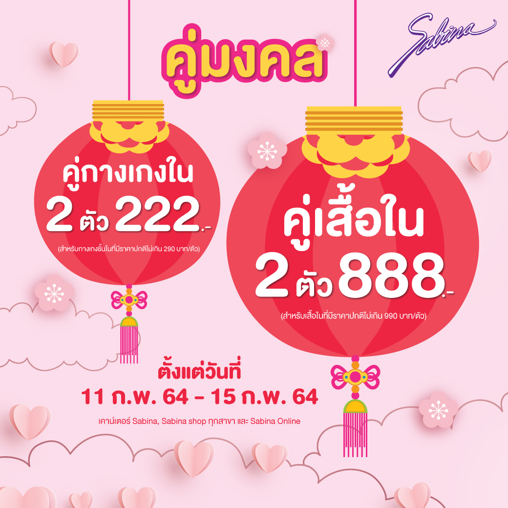 มิติหุ้น – ชุดชั้นใน “ซาบีน่า” ต้อนรับเทศกาลตรุษจีนและวาเลนไทน์ ด้วยโปรโมชั่นเสริมมงคลแบบมาเป็นคู่ กับโปรโมชั่น “คู่มงคล” เมื่อซื้อสินค้าเป็นคู่ในราคาพิเศษ โดยจัดโปรฯ ซื้อคู่เสื้อชั้นใน 2 ตัวในราคาเพียง 888 บาทสำหรับเสื้อชั้นในราคาปกติไม่เกินตัวละ 990 บาท และโปรฯ ซื้อคู่กางเกงชั้นใน 2 ตัวในราคาเพียง 222 บาทสำหรับกางเกงชั้นในราคาปกติไม่เกินตัวละ 290 บาท นอกจากนี้ เมื่อซื้อสินค้ายอดสุทธิครบ 1,200 บาท ยังได้รับประกันภัยโควิด-19 คุ้มครองสูงสุด 100,000 บาท นาน 90วัน จากอาคเนย์ประกันภัย ฟรีอีกด้วย