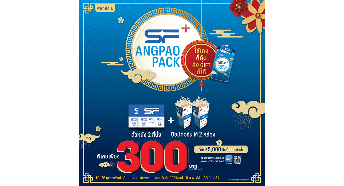 มิติหุ้น – โรงภาพยนตร์ในเครือ เอส เอฟ ต้อนรับเทศกาลตรุษจีนปีฉลู ส่งแพ็กเกจสุดพิเศษสำหรับสมาชิกบัตร SF+ กับ “SF+ Angpao Pack” ใช้เองก็คุ้ม ส่งต่อให้เพื่อนก็ได้ ในราคาพิเศษเพียง 300 บาท รับทันทีบัตรชมภาพยนตร์ที่นั่ง Deluxe จำนวน 2 ที่นั่ง พร้อมป๊อปคอร์น ขนาด M จำนวน 2 กล่อง ซื้อได้ตั้งแต่วันที่ 10-28 กุมภาพันธ์ 2564 ผ่านช่องทางออนไลน์ด้วยตนเองที่แอปพลิเคชัน SF Cinema และเว็บไซต์ www.sfcinema.com จำกัด 5,000 สิทธิ์เท่านั้น และสามารถใช้สิทธิ์ได้ตั้งแต่วันที่ 10 กุมภาพันธ์ – 30 มิถุนายน 2564 ที่โรงภาพยนตร์ในเครือ เอส เอฟ ทุกสาขา (ยกเว้นเอ็มพรีเว่ ซีเนคลับ)”