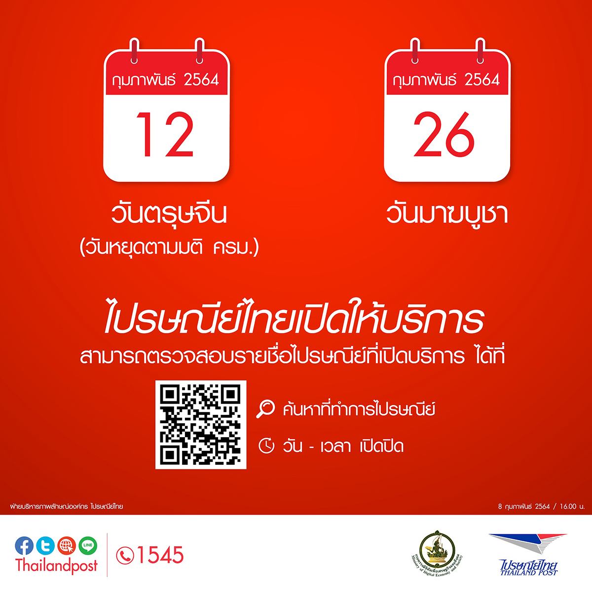 มิติหุ้น – บริษัท ไปรษณีย์ไทย จำกัด (ปณท) เปิดให้บริการในวันที่ 12 กุมภาพันธ์ 2564 ซึ่งเป็นวันหยุดราชการ เนื่องในวันตรุษจีน และวันที่ 26 กุมภาพันธ์ 2564 ซึ่งเป็นวันมาฆบูชา เพื่ออำนวยความสะดวกแก่ลูกค้าที่ต้องการใช้บริการฝากส่งสิ่งของ ตลอดจนการซื้อแสตมป์และสิ่งสะสมต่าง ๆ โดยมีจุดที่เปิดให้บริการทั้งในเขตกรุงเทพมหานครและต่างจังหวัดซึ่งผู้ใช้บริการสามารถตรวจสอบจุดให้บริการที่เปิดทำการและวันเวลาให้บริการผ่านคิวอาร์โค้ดและเว็บไซต์ https://kbms.thailandpost.com/portal หรือ THP Contact Center 1545