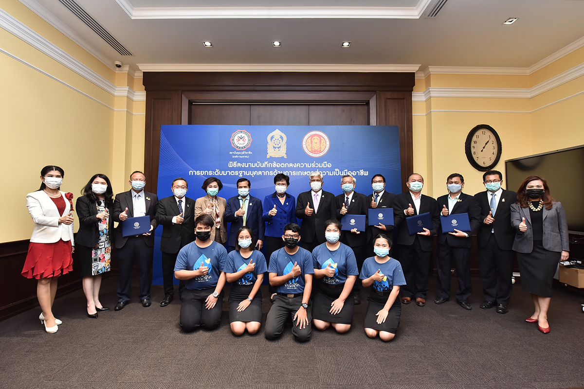โดยมี ดร.นพดล ปิยะตระภูมิ ผู้อำนวยการสถาบันคุณวุฒิวิชาชีพ นายทองอาบ บุญอาจ รักษาราชการแทน ผอ.สอก.ภาคกลาง นายประจักษ์ ทาสี ผอ.สอก.ภาคเหนือ นายพรณรงค์ วรศิลป์ ผอ.สอก.ภาคตะวันออกเฉียงเหนือ และนายวิศวะ คงแก้ว ผอ.สอก.ภาคใต้ ร่วมลงนามบันทึกข้อตกลง เพื่อร่วมกันยกระดับบุคลากรในอาชีพด้านการเกษตร รวมทั้งผู้ที่อยู่ในคุณวุฒิการศึกษา หรือกลุ่มที่ฝึกอบรมร่วมกับ สอก. ให้มีโอกาสได้เข้าสู่การประเมินสมรรถนะของบุคคลตามมาตรฐานอาชีพและคุณวุฒิวิชาชีพ มี สคช. ให้การการันตีเป็นมืออาชีพ เพื่อช่วยเพิ่มทักษะ ความเชี่ยวชาญ สร้างโอกาส และเสริมสร้างขีดความสามารถในอาชีพได้ และสามารถพัฒนาตัวเองจากเกษตรกรให้เป็นเกษตรกรตัวใหญ่ได้ด้วยการสนับสนุนจากหน่วยงานภาครัฐ