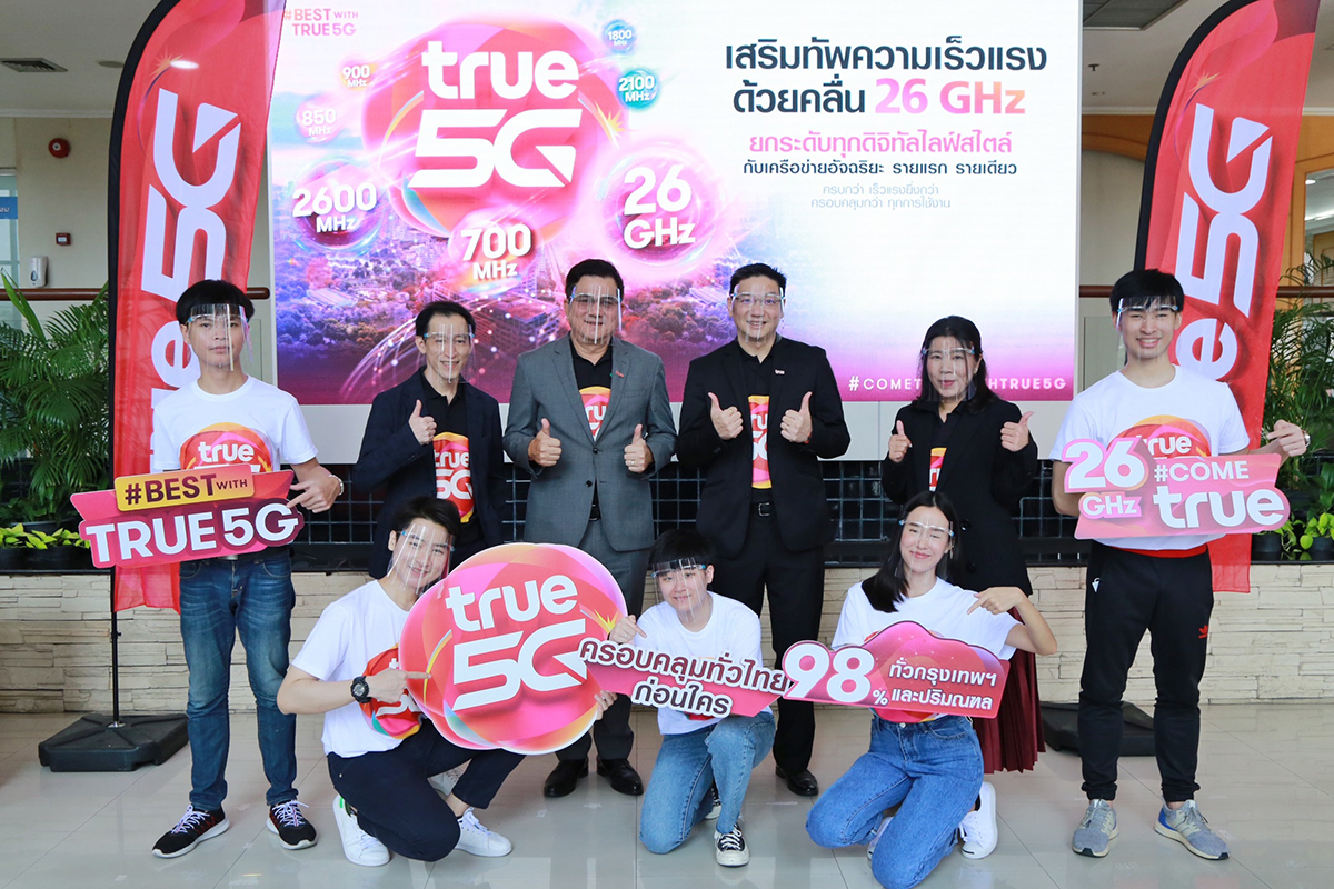 มิติหุ้น – สำนักงานคณะกรรมการกิจการกระจายเสียง กิจการโทรทัศน์ และกิจการโทรคมนาคมแห่งชาติ โดย พล.อ.สุกิจ ขมะสุนทร (ที่4จากขวา) ประธานคณะกรรมการ พร้อมด้วยคณะผู้บริหาร กสทช. มอบใบอนุญาตให้ใช้คลื่นความถี่สำหรับกิจการโทรคมนาคมย่าน 26 กิกะเฮิรตซ์ (GHz) ให้แก่ บริษัท ทรูมูฟ เอช ยูนิเวอร์แซล คอมมิวนิเคชั่น จำกัด โดยมี นายมนัสส์ มานะวุฒิเวช (ที่4จากซ้าย) กรรมการผู้จัดการใหญ่ (ร่วม) พร้อมคณะผู้บริหารกลุ่มทรู ร่วมรับมอบใบอนุญาตฯ เตรียมเดินหน้าเสริมทัพความเร็วแรงทรู 5G ด้วยคลื่น 26 GHz ประกาศขึ้นแท่นผู้นำ 5G ที่มีย่านความถี่มากที่สุดในไทย ครบสุดถึง 7 ย่านความถี่ ครบกว่า เร็วแรงยิ่งกว่า ครอบคลุมกว่าทุกการใช้งาน พร้อมย้ำความเป็น First Mover ตลอดกาลของกลุ่มทรู โดยล่าสุด มูฟเร็วสุด ปูพรมทรู 5G คลื่น 700MHz ทั่วประเทศไทยก่อนใครแล้ววันนี้ ด้วยเสาสัญญาณกว่า 10,000 เสาทั่วประเทศ โดยเฉพาะในกรุงเทพฯ และปริมณฑล ที่เครือข่ายอัจฉริยะทรู 5G ครอบคลุมแล้วถึง 98% ของประชากร พร้อมมอบประสบการณ์ที่ดีที่สุด ยกระดับดิจิทัลไลฟ์สไตล์ให้กับลูกค้าชาวไทย กับความเร็วแรงยิ่งกว่า ด้วยเทคโนโลยีเครือข่ายอัจฉริยะผสานคลื่นทุกย่านความถี่ ทั้งคลื่นย่านความถี่ต่ำที่โดดเด่นด้านความครอบคลุมและทะลุทะลวง ย่านความถี่กลางกับคุณสมบัติด้านความจุ รองรับปริมาณการใช้งานหนาแน่น รวมถึงคลื่นย่านความถี่สูงที่จะตอบโจทย์การใช้งานเฉพาะพื้นที่ โดยเฉพาะคลื่น 26GHz หรือ ”mmWave” Millimeter Wave ที่จะนำมาเสริมประสิทธิภาพการใช้งาน 5G สำหรับภาคอุตสาหกรรม รองรับพื้นที่เขตพัฒนาพิเศษภาคตะวันออก หรือ EEC และพื้นที่ที่มีความหนาแน่นสูง พร้อมนำศักยภาพ ทรู 5G เครือข่ายอัจฉริยะที่ดีที่สุด ต่อยอดระบบนิเวศ 5G เพื่อผู้บริโภคชาวไทย ตลอดจนยกระดับภาคอุตสาหกรรมในยุค 4.0 ร่วมสร้างอัจฉริยภาพสู่โลกใหม่ที่ยั่งยืนไปด้วยกัน