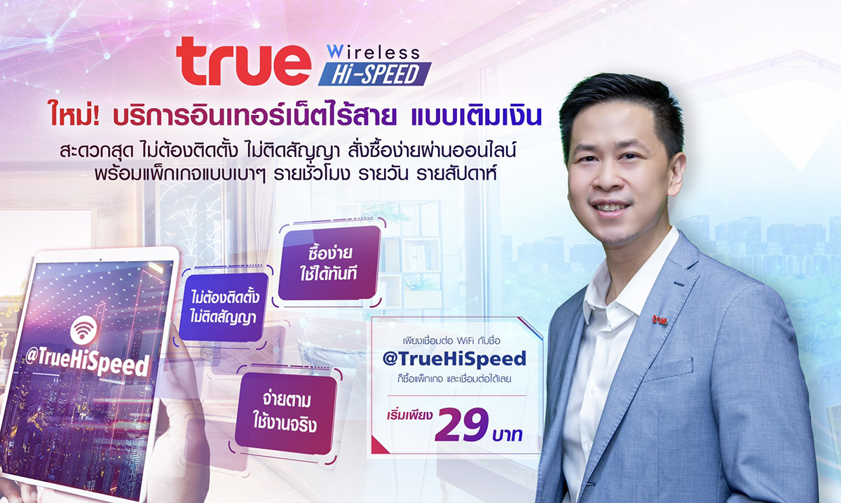 นายธนภูมิ ภาคย์วิศาล ผู้อำนวยการและหัวหน้าสายงานการพาณิชย์ ทรูออนไลน์ บมจ. ทรูคอร์ปอเรชั่นกล่าวว่า”ทรูออนไลน์ ในฐานะผู้นำบรอดแบนด์อินเทอร์เน็ตอันดับ 1 ของไทย มุ่งมั่นพัฒนานวัตกรรมเพื่อตอบโจทย์ลูกค้าชาวไทยทุกกลุ่มมาโดยตลอด ล่าสุด พร้อมนำเสนอบริการใหม่ Prepay True Wireless Hi-Speed เน็ตไร้สาย แบบเติมเงิน ซึ่งเป็นอีกขั้นของการพัฒนาเทคโนโลยีอย่างต่อเนื่องจากทรูออนไลน์ โดยเฉพาะเรื่องของการเพิ่มช่องสัญญาณ ที่ก่อนหน้านี้ได้ให้บริการ True Inno Hybrid Box ที่สามารถเพิ่มช่องสัญญาณ แยกท่อเคเบิ้ลทีวีและอินเตอร์เน็ตทีวีไว้ในกล่องเดียว รวมถึง Gamer Pro Pack จากทรูออนไลน์ ที่มีการเพิ่มช่องสัญญาณ แยก 3 ท่อตรง ท่อเล่นเกมส์ ท่อสตรีม/ดูสตรีม และท่อเล่นเน็ตทั่วไป เพื่อไม่ให้แย่งเน็ตกัน ถูกใจเกมเมอร์เป็นอย่างมาก และครั้งนี้ นับเป็นอีกหนึ่งความตั้งใจของทรูออนไลน์ ที่จะเพิ่มศักยภาพการให้บริการอินเทอร์เน็ตความเร็วสูงให้กับชาวไทย มีการเพิ่มช่องสัญญาณปล่อยแบนด์วิธเพิ่มขึ้นอีก 1 ท่อ สำหรับการให้บริการเน็ตความเร็วสูงแบบไร้สายรูปแบบใหม่ ซึ่งทีมงานได้เริ่มดำเนินการมาตั้งแต่ต้นปีที่ผ่านมา โดยพัฒนาเครือข่ายแบบ Fixed Wireless network กับ Fixed Broadband ที่อยู่บนเน็ตเวิร์คหลัก(Core Network) เดียวกัน ให้ผสมผสานร่วมกับโครงข่ายรองที่เข้าถึงพื้นที่ใช้งาน (Last Mile Network ) และอุปกรณ์โมเด็ม/เร้าเตอร์ ซึ่งได้มีการทดลองทดสอบบริการนี้มาตั้งแต่ช่วงไตรมาส 4 ที่ผ่านมา จนมั่นใจได้ว่ามีคุณภาพและเสถียรที่สุด จึงพร้อมนำมาเปิดให้บริการ Prepay True Wireless Hi-Speed เน็ตเร็วสูงไร้สายในรูปแบบเติมเงินใหม่นี้ ซึ่งลักษณะการให้บริการจะคล้ายโทรศัพท์เคลื่อนที่แบบเติมเงินซึ่งชาวไทยคุ้นเคยและเป็นที่นิยมอย่างมาก แต่มีข้อแตกต่างที่ดีกว่าคือ เติมเงินซื้อแพ็กเกจเท่าที่ต้องการจะใช้งานขณะนั้นเท่านั้น ก็สามารถเข้าใช้บริการเน็ตความเร็วสูงได้ทันที”