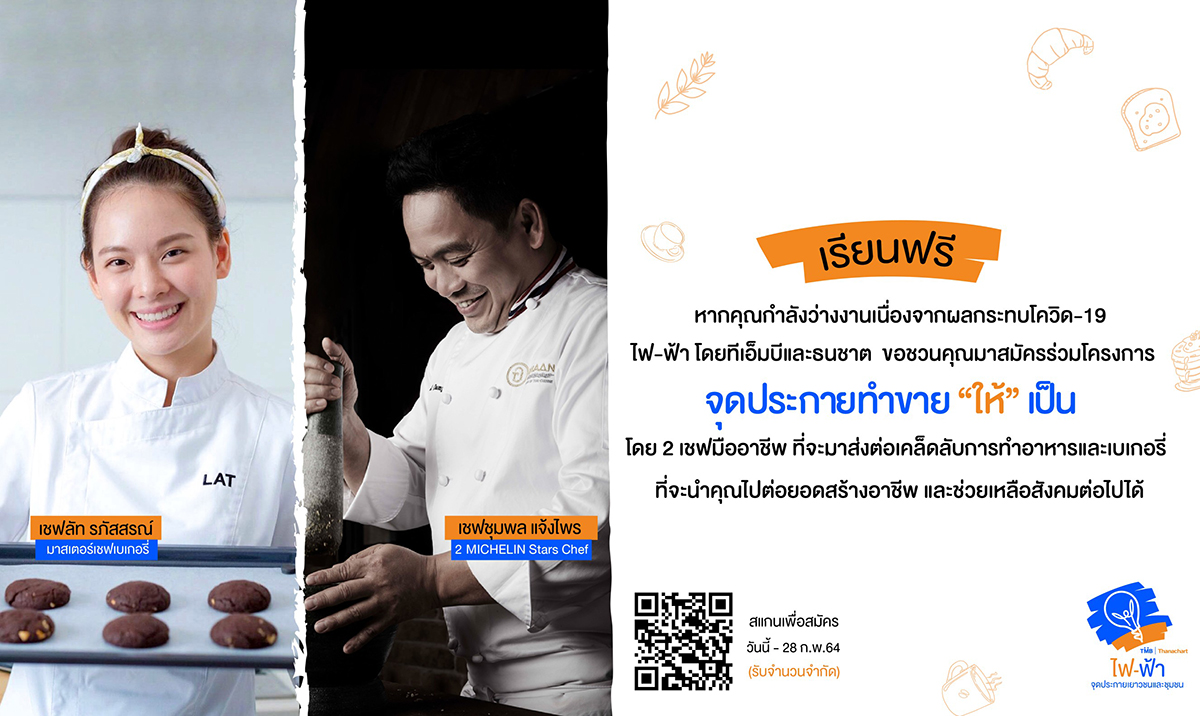 มิติหุ้น – ไฟ-ฟ้า” (FAI-FAH) โครงการเพื่อสังคมที่ยั่งยืนด้วยการจุดประกายพลังแห่งการให้ จากทีเอ็มบีและธนชาต เปิดพื้นที่ส่งต่อการให้กลับคืนสู่สังคม กับโครงการ จุดประกาย ทำขาย “ให้” เป็น เปิดคลาสครัว สอนทำอาหารและเบเกอรี่ฟรี! โดย 2 เชฟชื่อดัง “เชฟชุมพล แจ้งไพร” 2 MICHELIN Stars Chef และ “เชฟลัท รภัสสรณ์” มาสเตอร์เชฟเบเกอรี่ ที่พร้อมลงมือปฏิบัติจริง ถ่ายทอดเทคนิค และเคล็ดลับการทำอาหารระดับมืออาชีพ ให้แก่ผู้ที่ได้รับผลกระทบจากสถานการณ์โควิด-19 เพื่อเสริมทักษะพิเศษ และต่อยอดสร้างโอกาสทางอาชีพ พร้อมจุดประกายการนำความรู้ ส่งต่อการ “ให้” ช่วยเหลือชุมชน และสังคมต่อไป