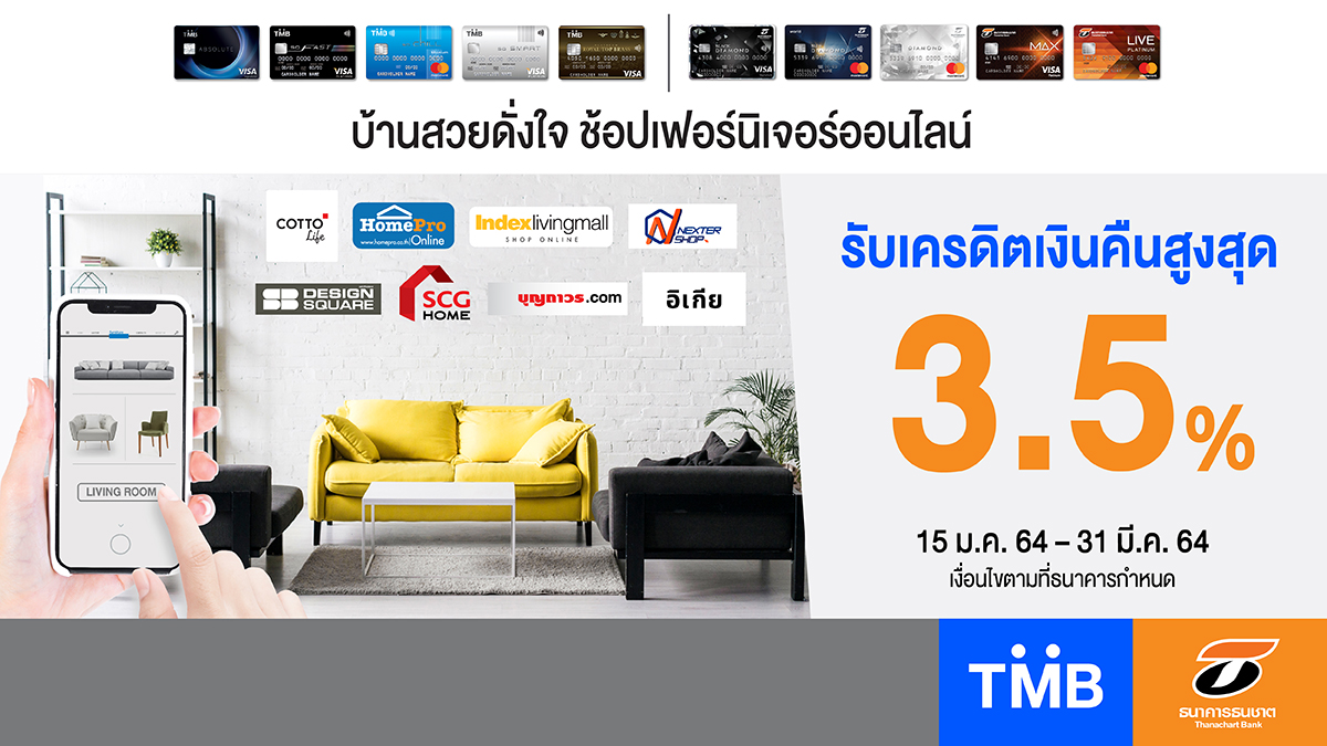 มิติหุ้น – บัตรเครดิตทีเอ็มบีและบัตรเครดิตธนชาต ให้คนรักบ้านได้แต่งบ้านอย่างมีสไตล์ ไม่ว่าอยู่ที่ไหนก็ช้อปเฟอร์นิเจอร์ออนไลน์ได้ พร้อมรับเครดิตเงินคืนสูงสุด 3.5% เมื่อมียอดใช้จ่ายที่ร้านค้าออนไลน์ที่ร่วมรายการ ได้แก่ HomePro Online, IKEA Online, Index Living Mall Online, SB Design Square Online, SCG Home Online, Boonthavorn Online, cottolife.com, nextershop.com ตั้งแต่วันนี้ ถึง 31 มีนาคม 2564