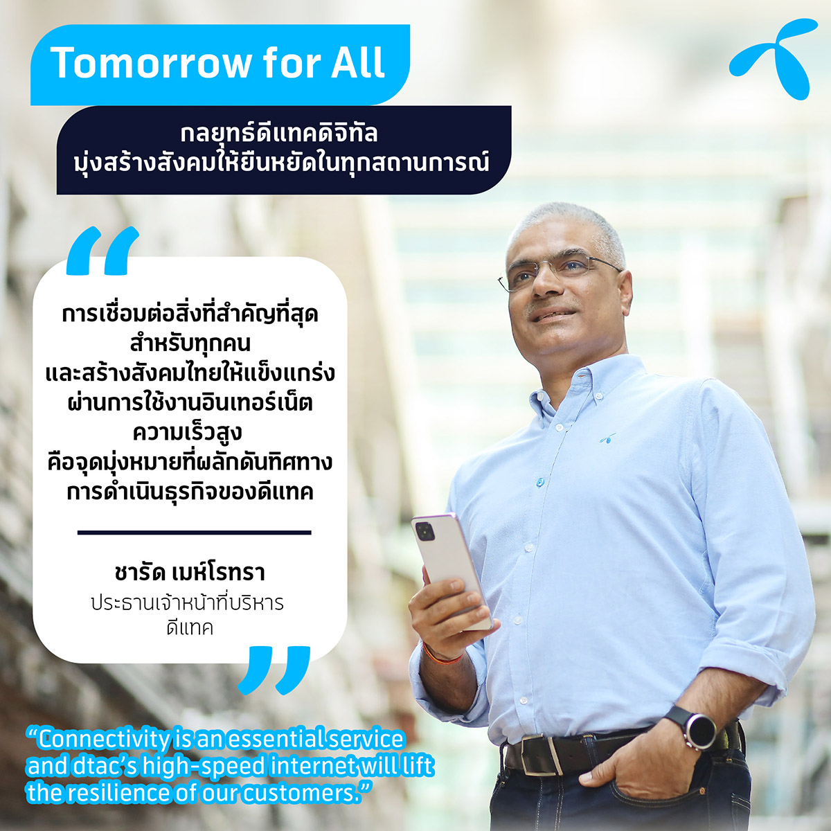 นายชารัด เมห์โรทรา ประธานเจ้าหน้าที่บริหาร บริษัท โทเทิ่ล แอ็คเซ็ส คอมมูนิเคชั่น จำกัด (มหาชน) หรือดีแทค กล่าวว่า “การเชื่อมต่อคือสิ่งที่สำคัญที่สุดสำหรับทุกคน และสร้างสังคมไทยให้แข็งแกร่งผ่านการใช้งานอินเทอร์เน็ตความเร็วสูง นี่คือจุดมุ่งหมายที่ในการดำเนินธุรกิจของดีแทค นอกจากนั้น ดีแทคยังสนับสนุนสิ่งต่างๆ อีกมากจะช่วยเปลี่ยนผ่านผู้ใช้งานสู่ชีวิตดิจิทัล”