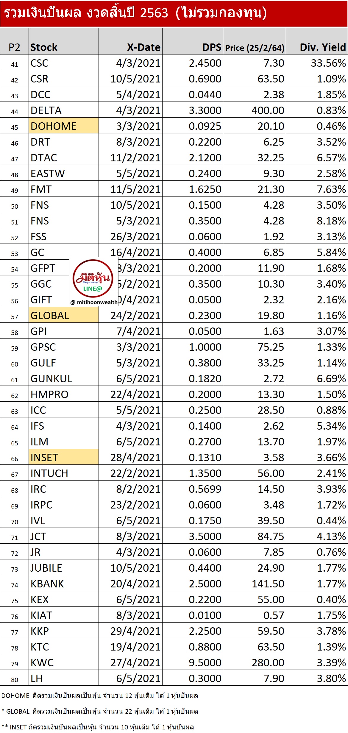 นสพ มิติหุ้น ทำการรวบรวมเงินปันผลของหุ้นที่ประกาศการจ่ายปันผล หลังการประกาศผลประกอบการปี 2563 ถึงวันที่ 19 กุมภาพันธ์ 2564 โดยเรียงลำดับตามชื่อหุ้น หากนักลงทุนจะเลือกหุ้นปันผลที่ให้ผลตอบแทนดีนั้น มีข้อควรพิจารณาดังนี้
