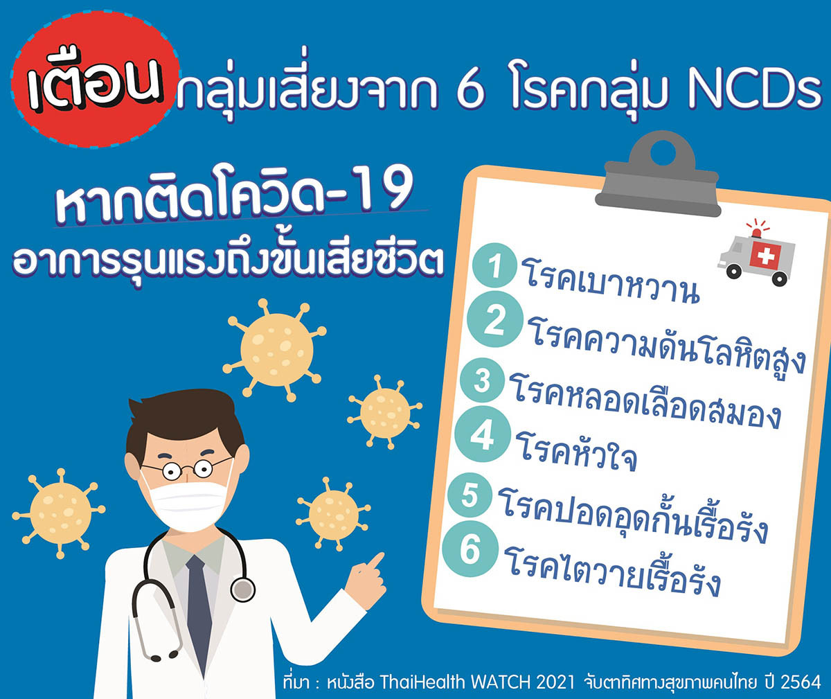 ที่น่ากังวลคือ ผู้ป่วยกลุ่มเสี่ยงจาก 6 โรคกลุ่ม NCDs ได้แก่ โรคเบาหวาน โรคความดันโลหิตสูง โรคหลอดเลือดสมอง โรคหัวใจ โรคอุดกั้นเรื้อรัง และโรคไตวายเรื้อรัง หากติดเชื้อโควิด-19 จะมีความเสี่ยงเกิดอาการรุนแรงถึงขั้นเสียชีวิต เพราะเป็นโรคที่ส่งผลต่อภูมิคุ้มกันของร่างกายและระบบทางเดินหายใจโดยตรง