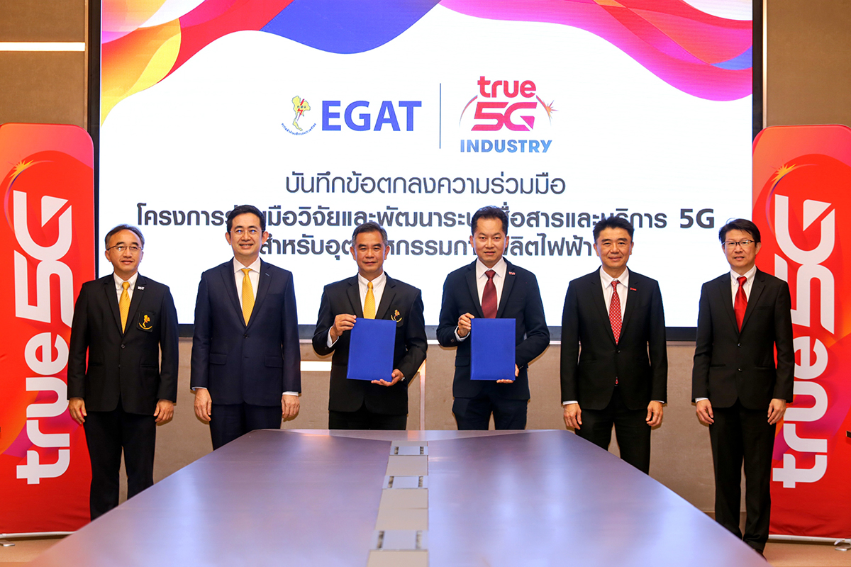 แห่งประเทศไทย (กฟผ.) พร้อมด้วย นายพิรุณ ไพรีพ่ายฤทธิ์ (คนนั่งขวา) หัวหน้าคณะทำงานและกรรมการยุทธศาสตร์ 5G บมจ.ทรู คอร์ปอเรชั่น ร่วมลงนาม MOU โครงการวิจัยและพัฒนาระบบสื่อสารและบริการ 5G สำหรับอุตสาหกรรมการผลิตไฟฟ้า ระหว่าง การไฟฟ้าฝ่ายผลิตแห่งประเทศไทย (กฟผ.) และ กลุ่มทรู โดยจะร่วมศึกษาและพัฒนาการนำโครงข่ายและอุปกรณ์ที่รองรับระบบ 5G มาทดสอบใช้งานที่ กฟผ. แม่เมาะ จ.ลำปาง เพื่อยกระดับอุตสาหกรรมผลิตไฟฟ้าในยุคดิจิทัล โดยมีนายบุญญนิตย์ วงศ์รักมิตร (คนยืนซ้าย) ผู้ว่าการ กฟผ. และนายพิชิต ธันโยดม (คนยืนขวา) หัวหน้าคณะผู้บริหาร ด้านธุรกิจองค์กร บมจ.ทรู คอร์ปอเรชั่น ร่วมเป็นสักขีพยาน ณ อาคาร 50 ปี กฟผ. สำนักงานใหญ่ กฟผ. อ.บางกรวย จ.นนทบุรี