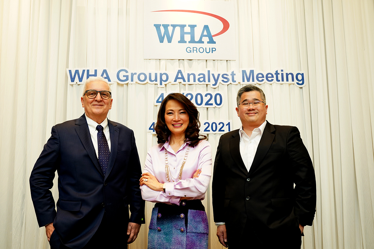 มิติหุ้น – เมื่อเร็วๆ นี้ นางสาวจรีพร จารุกรสกุล (กลาง) ประธานคณะกรรมการบริษัท และประธานเจ้าหน้าที่บริหารกลุ่ม บมจ.ดับบลิวเอชเอ คอร์ปอเรชั่น (WHA Group) พร้อมด้วย มร.เดวิด นาร์โดน (ซ้าย) ประธานเจ้าหน้าที่บริหาร ธุรกิจนิคมอุตสาหกรรม และการลงทุนต่างประเทศ บริษัท ดับบลิวเอชเอ อินดัสเตรียล ดีเวลลอปเมนท์ จำกัด (มหาชน) และนายณัฐพรรษ ตันบุญเอก (ขวา) ประธานเจ้าหน้าที่ฝ่ายการเงิน WHA Group ร่วมให้ข้อมูลนักวิเคราะห์ หลังจากประกาศผลการดำเนินปี 2563 มีรายได้รวมและส่วนแบ่งกำไรปกติ 9,376.0 ล้านบาท กำไรปกติ จำนวน 2,542.6 ล้านบาท และจ่ายปันผลเพิ่มเติมอัตราหุ้นละ 0.0635 บาท โดยจะขึ้นเครื่องหมาย XD วันที่ 7 พ.ค.นี้ และกำหนดจ่ายเงินปันผล วันที่ 25 พ.ค.นี้ พร้อมส่งสัญญาณภาพรวมธุรกิจอุตสาหกรรมของดับบลิวเอชเอ ทั้งในประเทศ และ ต่างประเทศ มีอัตราการเติบโตและขยายตัวอย่างต่อเนื่อง