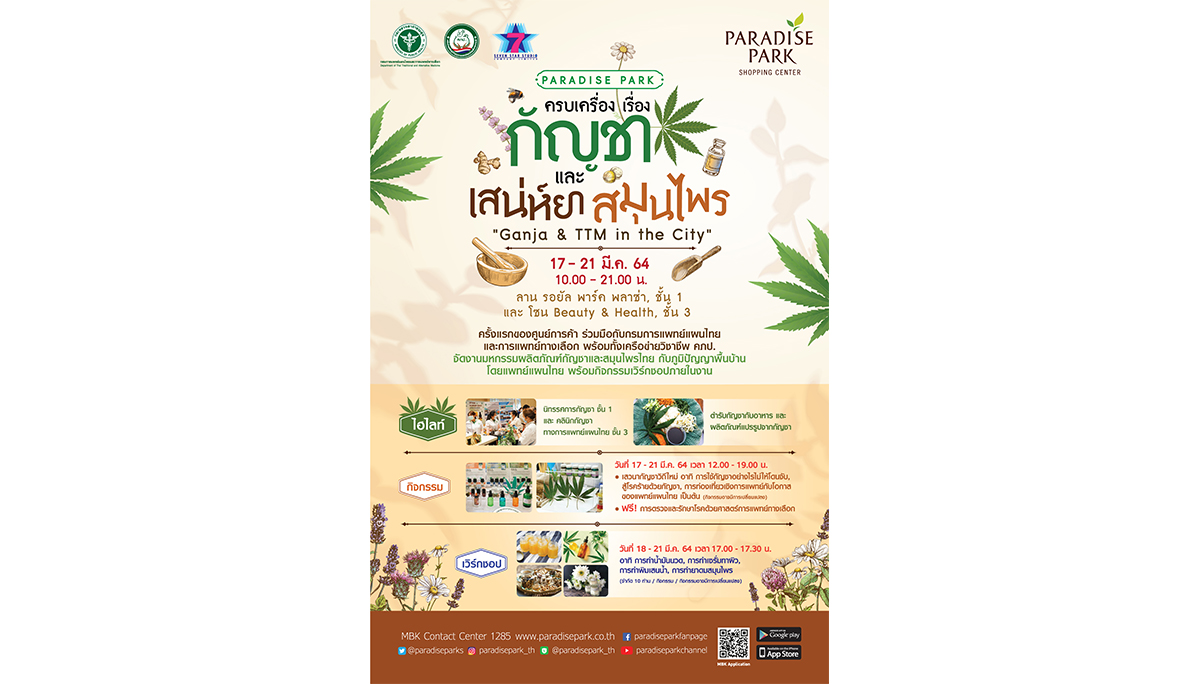 มิติหุ้น – พาราไดซ์ พาร์ค ศูนย์การค้าในเครือเอ็ม บี เค เซ็นเตอร์ ร่วมกับ กรมการแพทย์แผนไทยและการแพทย์ทางเลือก กระทรวงสาธารณสุข เครือข่ายพลังภูมิปัญญาการแพทย์แผนไทย สร้างปรากฏการณ์ครั้งใหม่เมืองไทย กับการยกกัญชาไว้ในศูนย์การค้า ชวนมา ช้อป ชิม แชร์ สินค้าภายใน งานมหกรรมผลิตภัณฑ์กัญชาและสมุนไพรไทย ครบเครื่องเรื่องกัญชาและเสน่ห์ยาสมุนไพร “Ganja & TTM In the City” พาคุณไปสัมผัสกัญชาวิถีใหม่อย่างถูกต้องตามกฏหมาย การใช้กัญชาเพื่อการรักษาตามหลักการแพทย์ รวมทั้งภูมิปัญญาพื้นบ้าน พบกับ ไฮไลต์ นิทรรศการกัญชา, ตำรับกัญชากับอาหาร, คลินิคกัญชาทางการแพทย์แผนไทย และผลิตภัณฑ์แปรรูปจากกัญชา นอกจากนี้ยังมีกิจกรรมน่าสนใจ ทั้งเสวนากัญชาวิถีใหม่ กิจกรรม Workshop สอนทำน้ำมันนวด, การทำเซรั่มทาผิว, การทำพิมเสนน้ำ, การทำยาดมสมุนไพร เป็นต้น และฟรี!! การตรวจและรักษาโรคด้วยศาสตร์การแพทย์ทางเลือก อีกด้วย