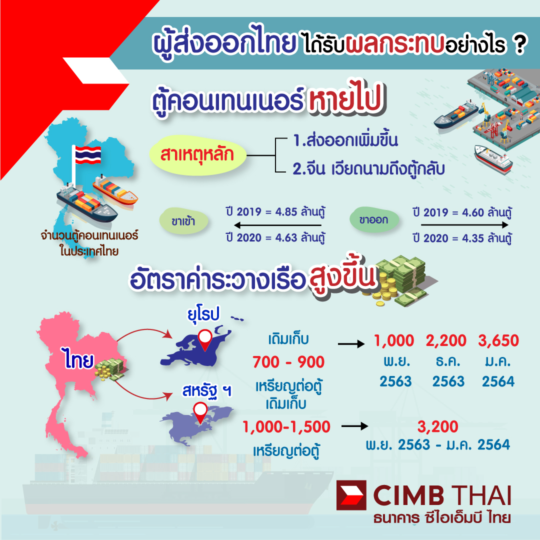 เดือนกรกฎาคม 2020 หลังการแพร่ระบาดโควิด-19 ในจีนคลี่คลาย เป็นช่วงที่จีนเร่งส่งออกสินค้า ทำให้ความต้องการใช้ตู้คอนเทนเนอร์ส่งออกสินค้าเพิ่มขึ้น เกิดปัญหาการขาดแคลนตู้คอนเทนเนอร์และค่าระวางเรือที่สูง ส่วนประเทศปลายทางส่งออกอย่างสหรัฐฯ และยุโรป โควิด-19 ยังคงแพร่ระบาดอยู่ ส่งผลให้ตู้คอนเทนเนอร์ตกค้างที่ท่าเรือสหรัฐฯและยุโรปจำนวนมาก ต้องใช้เวลานานในการนำตู้คอนเทนเนอร์เปล่ากลับคืนประเทศต้นทาง แม้ว่าสถานการณ์การแพร่ระบาดทิศทางดีขึ้น แต่สายเดินเรือยังใช้ปริมาณเรือขนส่งเท่าเดิม ส่งผลให้ไม่มีที่วางตู้คอนเทนเนอร์ จำนวนเรือไม่เพียงพอในการขนส่ง และค่าระวางปรับสูงขึ้น