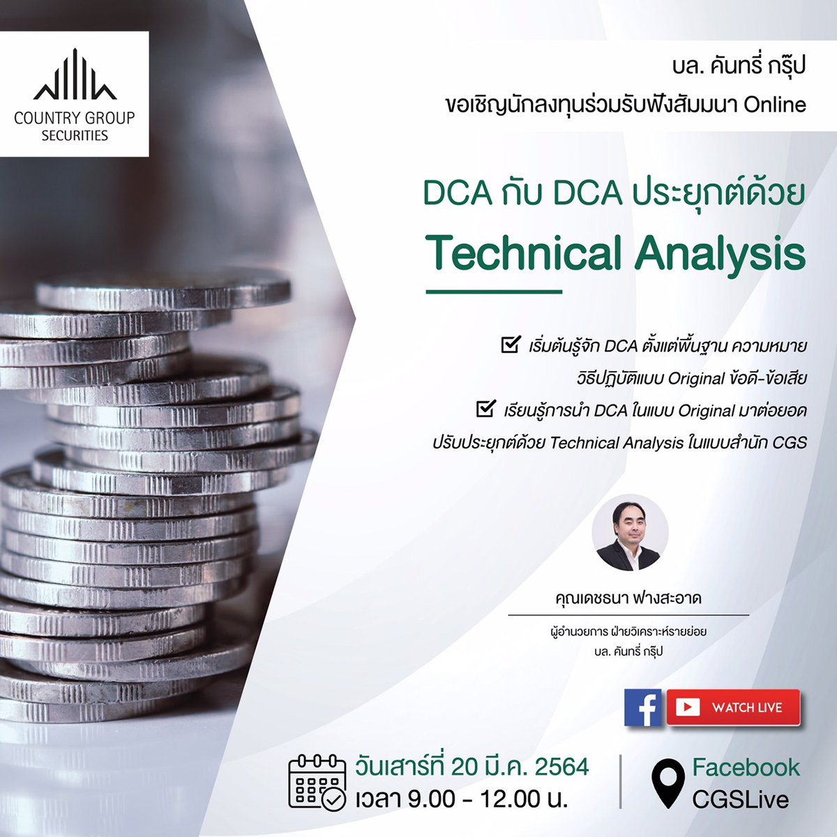 มิติหุ้น – บริษัท หลักทรัพย์คันทรี่ กรุ๊ป จำกัด (มหาชน) หรือ CGS เตรียมจัดงานสัมมนาคุณภาพ เพื่อให้ความรู้ในเชิงลึกแก่นักลงทุนที่สนใจเรื่อง DCA ในรูปแบบออนไลน์ (online) ในหัวข้อ “DCA กับ DCA ประยุกต์ด้วย Technical Analysis”จึงขอเชิญชวนนักลงทุนและผู้สนใจทั่วไป เข้าร่วมฟังการบรรยายได้โดยไม่เสียค่าใช้จ่าย ในวันเสาร์ที่ 20 มี.ค. 2564 เวลา 9.00 – 12.00 น.