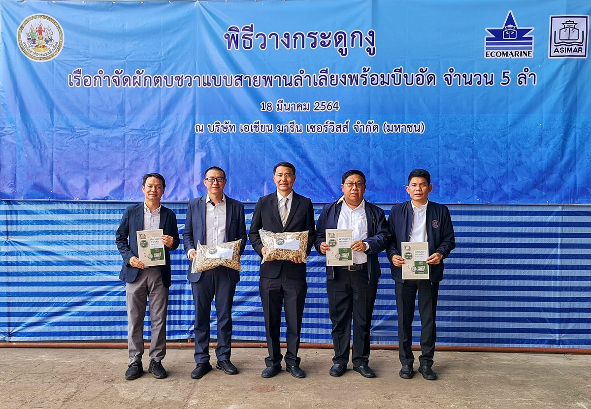มิติหุ้น – เมื่อวันที่ 18 มีนาคม 2564 อาชิม่าและอีโคมารีนได้ฤกษ์ทำพิธีวางกระดูกงูเรือกำจัดผักตบชวาแบบสายพานลำเลียงพร้อมบีบอัดให้แก่กรมโยธาธิการและผังเมือง จำนวน 5 ลำ มูลค่ากว่า 50 ล้านบาท โดยมีนายสุเมธ มีนาภา (กลาง) ผู้ตรวจราชการกรมโยธาธิการและผังเมืองให้เกียรติเป็นประธานในพิธี พร้อมถ่ายรูปเป็นที่ระลึกร่วมกับนายสุรเดช ตัณฑ์ไพบูลย์ (ที่ 2 จากซ้าย) ประธานเจ้าหน้าที่บริหารของบริษัทฯ โดยเรือชุดใหม่นี้มีกำหนดส่งมอบในเดือนกันยายน 2564 ซึ่งอาชิมาได้นำนวัตกรรมการบีบอัดผักตบชวาเพื่อเพิ่มปริมาณบรรทุกในแต่ละเที่ยว ทำให้ช่วยเพิ่มประสิทธิภาพของเครื่องจักรและลดระยะเวลาในการทำงาน