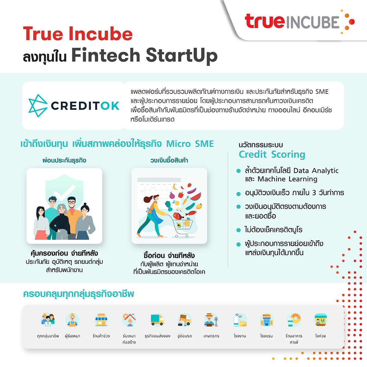 ดร.ธีระพล ถนอมศักดิ์ยุทธ หัวหน้าคณะผู้บริหารด้านนวัตกรรมและความยั่งยืน บมจ.ทรู คอร์ปอเรชั่น กล่าวว่า “ทรู อินคิวบ์ มีพันธกิจในการสร้างแรงบันดาลใจ สนับสนุนการสร้างสรรค์นวัตกรรมและบ่มเพาะสตาร์ทอัพให้เติบโตอย่างแข็งแกร่ง ตลอดจนลงทุนในสตาร์ทอัพที่มีศักยภาพการเติบโตและมุ่งเน้นการใช้เทคโนโลยีดิจิทัลเข้ามาขับเคลื่อนธุรกิจ ซึ่งจะสร้างความได้เปรียบในการแข่งขันให้เติบโตได้อย่างยั่งยืน ล่าสุด ทรู อินคิวบ์ ได้ร่วมลงทุนในสตาร์ทอัพฟินเทค “เครดิตโอเค” ซึ่งเป็นแพลตฟอร์มรวบรวมผลิตภัณฑ์ทางการเงินและประกันภัย สำหรับผู้ประกอบการรายย่อย ที่มุ่งช่วยเสริมสภาพคล่องแก่ธุรกิจขนาดกลาง ขนาดเล็กและขนาดย่อม (Micro SMEs) ให้สามารถเข้าถึงแหล่งเงินทุนได้ โดยใช้เทคโนโลยีวิเคราะห์ฐานข้อมูลขนาดใหญ่ (Data Analytics) ในการสร้างระบบคะแนนเครดิต (Credit Scoring) เพื่อประเมินความเสี่ยงและอนุมัติวงเงินเครดิตในการซื้อสินค้าจากพันธมิตรคู่ค้าของเครดิตโอเค โดยทรู อินคิวบ์ จะผสานความเชี่ยวชาญของทีมนักวิเคราะห์ข้อมูลในกลุ่มทรู ในการร่วมพัฒนาโซลูชันการให้คะแนนเครดิตที่สมบูรณ์และมีประสิทธิภาพมากยิ่งขึ้น เพื่อเสริมศักยภาพในการประเมินความเสี่ยงและกำหนดวงเงินอนุมัติที่เหมาะสมได้อย่างรวดเร็วและแม่นยำ ตลอดจนสนับสนุนการขยายฐานลูกค้าไปยังกลุ่มผู้ประกอบการรายย่อยที่เป็นพันธมิตรกับกลุ่มธุรกิจค้าปลีกในเครือเจริญโภคภัณฑ์อีกด้วย มั่นใจว่า การร่วมลงทุนกับ “เครดิตโอเค” ในครั้งนี้ จะเสริมความแข็งแกร่ง สร้างการเติบโต เพิ่มมูลค่าของบริษัทสตาร์ทอัพไทย และที่สำคัญช่วยต่อลมหายใจของผู้ประกอบการรายย่อย ทำให้สามารถเดินหน้าธุรกิจได้อย่างต่อเนื่อง โดยเฉพาะช่วงที่ต่างได้รับผลกระทบจากวิกฤตโควิด-19 ซึ่งเป็นการช่วยสนับสนุนการเติบโตของเศรษฐกิจของประเทศด้วย