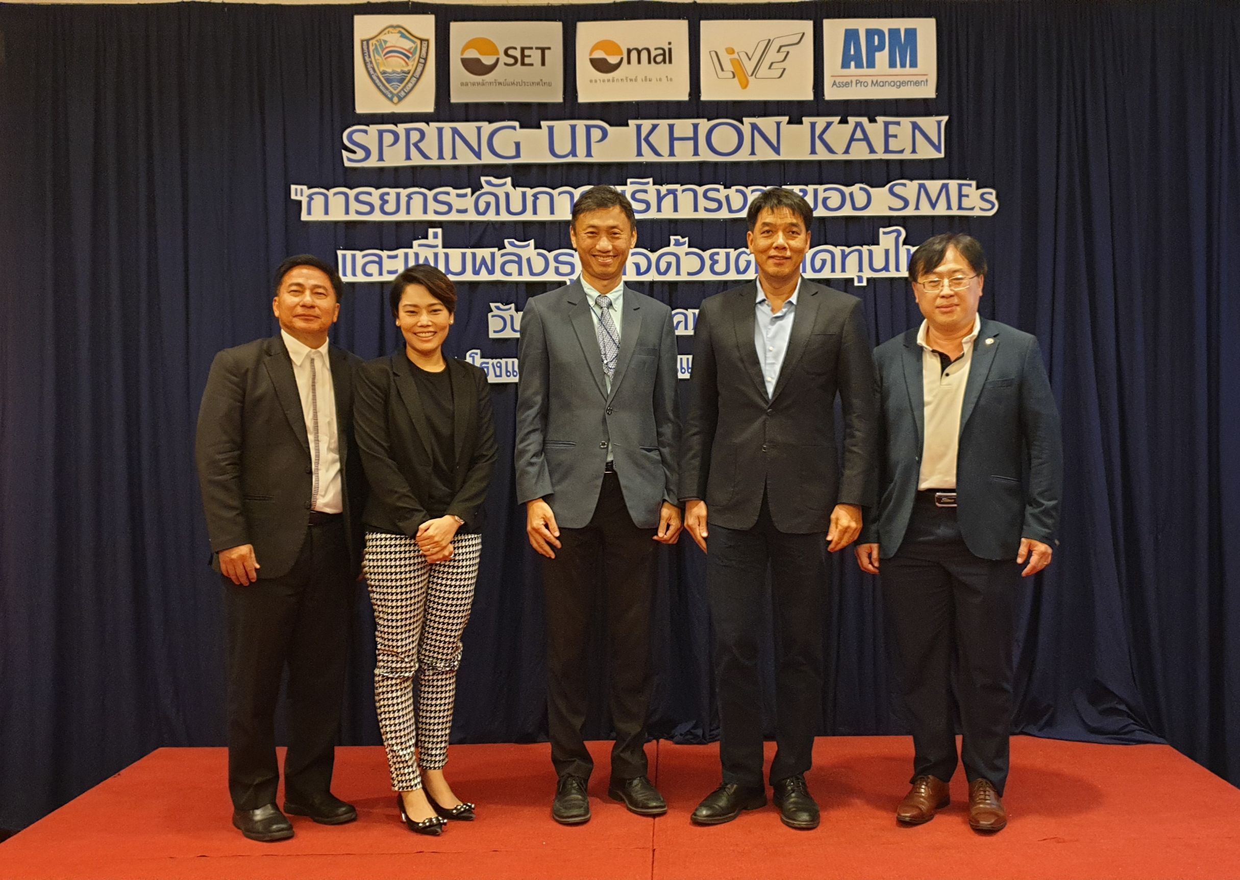 ตลาดหลักทรัพย์แห่งประเทศไทย และตลาดหลักทรัพย์ เอ็ม เอ ไอ (mai) ร่วมกับหอการค้าจังหวัดขอนแก่น และบริษัท แอสเซท โปร แมเนจเม้นท์ จำกัด (APM) ร่วมกันจัดงานสัมมนา Spring Up Khon Kaen “การยกระดับการบริหาร SMEs และเพิ่มพลังธุรกิจด้วยตลาดทุยไทย โดยมี คุณชาญณรงค์ บุนิสตระกูล ประธานหอการค้าจังหวัดขอนแก่น กล่าวปาฐกถาพิเศษ พร้อมด้วยคุณประพันธ์ เจริญประวัติ ผู้จัดการตลาดหลักทรัพย์ เอ็ม เอ ไอ (mai) บรรยายหัวข้อ “เพิ่มพลังธุรกิจด้วยตลาดหลักทรัพย์ SET / mai / LIVE” โดยมี ดร.สมภพ ศักดิ์พันธ์พนม ประธานกรรมการ APM คุณสวิตา สุวรรณสวัสดิ์ Founder & CEO MSC International Law Office Company Limited และคุณอำนวย จิรมหาโภคา ผู้ช่วยผู้จัดการหัวหน้ากลุ่มงานผู้ออกหลักทรัพย์ 1 ตลาดหลักทรัพย์ฯ ร่วมฟังงานสัมมนาดังกล่าว ที่โรงแรมพูลแมน ขอนแก่น ราชา ออคิด เมื่อเร็วๆนี้