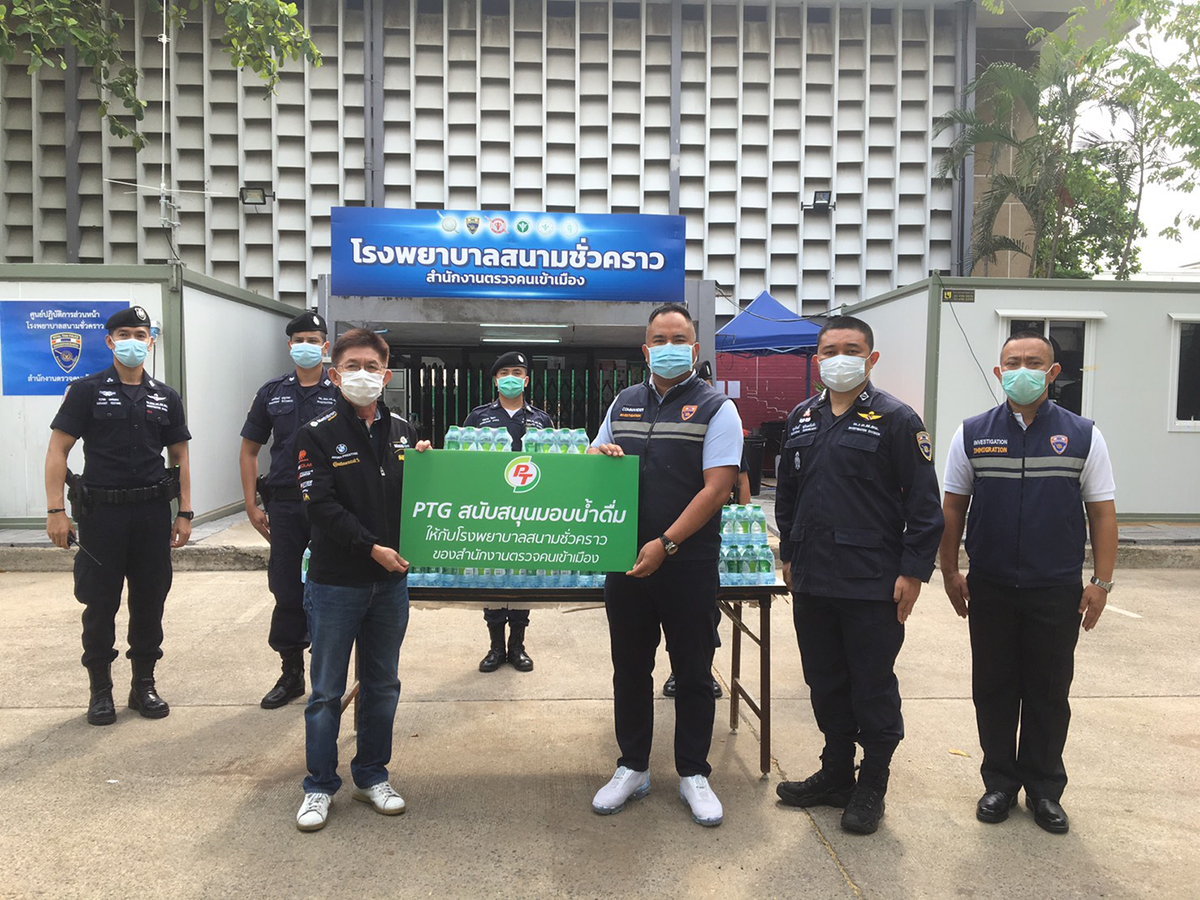 มิติหุ้น – นายฉลอง ติรไตรภูษิต ผู้อำนวยการฝ่ายสื่อสารองค์กร บริษัท พีทีจี เอ็นเนอยี จำกัด (มหาชน) หรือ PTG เป็นตัวแทนบริษัท ส่งมอบน้ำดื่มให้กับ พล.ต.ต.พันธนะ นุชนารถ ผู้บังคับการสืบสวน สำนักงานตรวจคนเข้าเมือง หรือ สตม. เพื่อนำไปมอบให้กับโรงพยาบาลสนามชั่วคราว สตม. ณ อาคารโรงยิมกองสวัสดิการตำรวจ ในพื้นที่สโมสรตำรวจ เมื่อเร็วๆ นี้