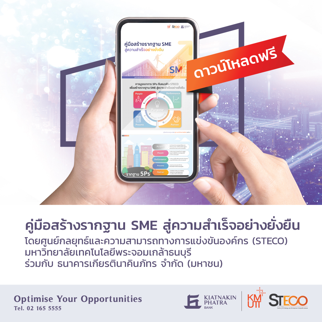 คู่มือสร้างรากฐาน SME สู่ความสำเร็จอย่างยั่งยืน ได้ถูกออกแบบเฉพาะให้กับผู้ประกอบการเอสเอ็มอี ให้สามารถนำไปประยุกต์ใช้เพื่อฟื้นฟูและสร้างความยั่งยืนให้กับธุรกิจ ประกอบด้วยรากฐาน 5Ps 1. Purpose ธุรกิจจำเป็นต้องมีเป้าหมายที่ชัดเจนและดำเนินธุรกิจเพื่อบรรลุเป้าหมายที่กำหนดไว้ เป้าหมายที่ดีควรสอดคล้องกับความต้องการของลูกค้า 2. People ธุรกิจจำเป็นต้องคัดเลือกและพัฒนาบุคลากรให้สามารถดำเนินกิจกรรมทางธุรกิจตามกระบวนการที่ออกแบบไว้ให้สอดคล้องกับความต้องการของลูกค้าและเป้าหมายของธุรกิจ 3. Performance ธุรกิจจำเป็นต้องกำหนดการตัวชี้วัดเพื่อประเมินผลการดำเนินงานให้เป็นไปตามเป้าหมายของธุรกิจ นำไปสู่การปรับปรุงธุรกิจให้มีประสิทธิภาพมากยิ่งขึ้น 4. Process ธุรกิจจำเป็นต้องออกแบบกระบวนการทำงานให้สอดคล้องกับเป้าหมายของธุรกิจ ซึ่งกระบวนการทำงานจะเป็นหัวใจสำคัญ ในการเลือกทรัพยากรไม่ว่าจะเป็นคนหรือเทคโนโลยีให้เหมาะสมกับกระบวนการทำงาน 5. Partner ธุรกิจจำเป็นคัดเลือกและพัฒนาความสัมพันธ์กับพันธมิตรทางธุรกิจเพื่อส่งเสริมความแข็งแกร่งในการดำเนินธุรกิจ