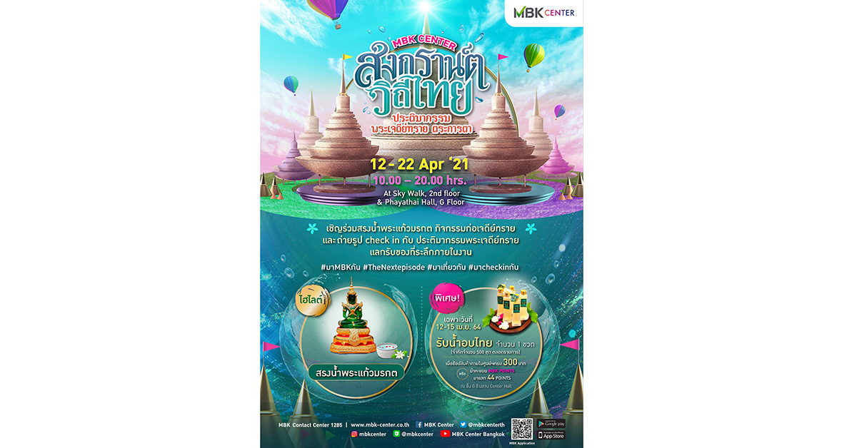 มิติหุ้น-ศูนย์การค้าเอ็ม บี เค เซ็นเตอร์ ชวนร่วมสืบสานประเพณีไทยวันสงกรานต์แบบNew Normal ในกิจกรรม MBK CENTER สงกรานต์วิถีไทย ห่างไกลโควิด-19 ระหว่างวันที่ 12 – 22 เมษายน 2564 โดยได้อัญเชิญพระแก้วมรกตมาให้ประชาชนสักการะ และสรงน้ำเสริมความเป็นสิริมงคลต้อนรับปีใหม่ไทย พร้อมเชื่อมความสัมพันธ์กับกิจกรรมก่อเจดีย์ทราย บริเวณชั้น G ลานพญาไท ฮอลล์ และตระการตากับประติมากรรมพระเจดีย์ทรายจากทีมแชมป์ดีกรีผู้ชนะเลิศการประกวดก่อพระเจดีย์ทรายในเทศกาลวันไหลบางแสน จุดเช็คอิน แชะ&แชร์สุดชิค บริเวณลานสกายวอล์ค ทางเข้าศูนย์การค้าชั้น 2 และ ชั้น G ลานพญาไท ฮอลล์