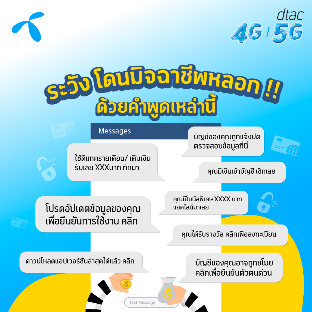 เมื่อลูกค้ามีการขอรหัสเพื่อยืนยันตัวตนในการทำธุรกรรมต่างๆ ดีแทคได้เพิ่มคำเตือนในทุกข้อความ (SMS) ที่ส่งรหัส OTP หาลูกค้าเพื่อย้ำว่าห้ามบอกรหัสที่ได้รับกับคนอื่น เพราะอาจจะเป็นมิจฉาชีพหลอกถามข้อมูลได้ ทั้งนี้ หากมีการใช้เบอร์โทรศัพท์ผูกบัญชีธนาคารผ่าน Mobile Banking ถ้าพบว่าซิมการ์ด (Sim card) ใช้งานไม่ได้ตามปกติหรือถูกระงับโดยไม่มีสาเหตุ ขอให้รีบติดต่อผู้ให้บริการมือถือโดยทันทีเพื่อช่วยทำการตรวจสอบ เนื่องจากหมายเลขโทรศัพท์อาจกำลังถูกมิจฉาชีพแอบอ้างไปออกซิมการ์ดใหม่