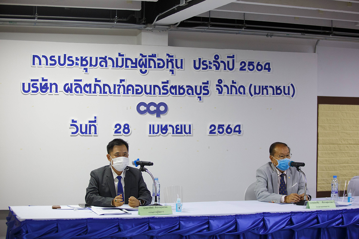 มิติหุ้น – นายประทีป ทีปกรสุขเกษม ประธานกรรมการ (ขวา) นายอาทิตย์ ทีปกรสุขเกษม กรรมการผู้จัดการ (ซ้าย) พร้อมคณะกรรมการและผู้บริหาร บริษัท ผลิตภัณฑ์คอนกรีตชลบุรี จำกัด (มหาชน) (CCP) จัดประชุมสามัญผู้ถือหุ้