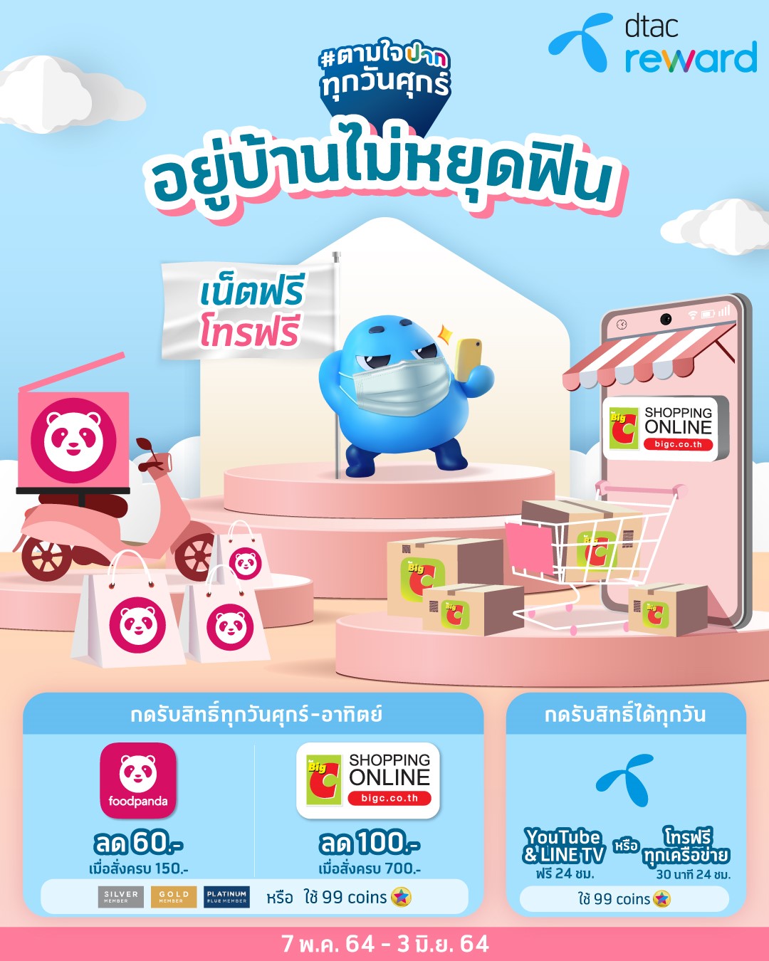 ในช่วงเดือนพฤษภาคม ถึง มิถุนายน ที่มีการ work From Home me ดีแทค รีวอร์ดได้จัดสิทธิพิเศษ ดูแลลูกค้าที่ทำงานอยู่ที่บ้านให้ปลอดภัยห่างไกลโควิด-19 ภายใต้แคมเปญตามใจปากทุกวันศุกร์ ผ่านช่องทางดีแทค แอป สำหรับลูกค้า Silver Member/Gold Member/Platinum Blue Member หรือใช้เพียง 99 Coins รับส่วนลด 60 บาท เมื่อสั่งอาหารผ่าน foodpanda ครบ 150 บาท และรับส่วนลด 100 บาท เมื่อช้อปปิ้งออนไลน์จาก Big C Shopping Online ครบ 700 บาท เริ่มตั้งแต่วันที่ 7 พ.ค. – 3 มิ.ย. 2564 กดรับสิทธิ์ทุกวันศุกร์ถึงวันอาทิตย์