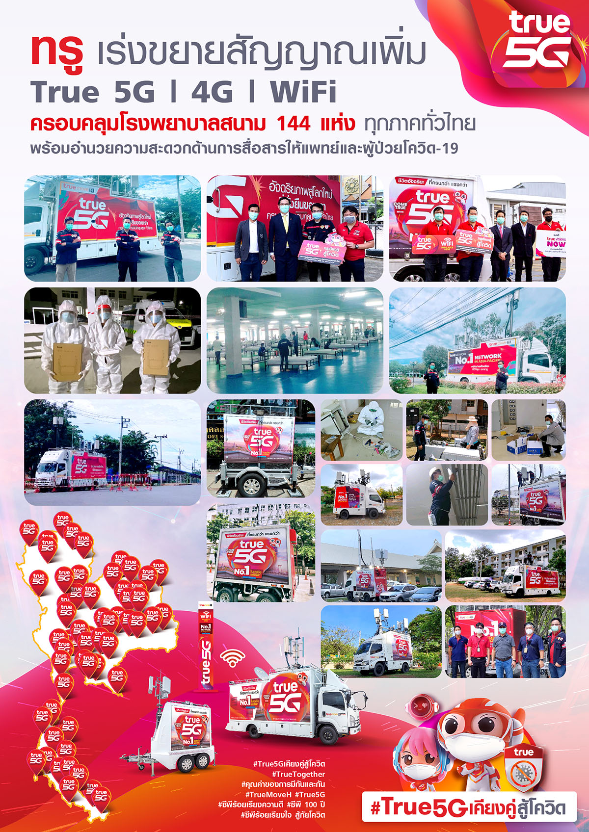 นายมนัสส์ มานะวุฒิเวช กรรมการผู้จัดการใหญ่ (ร่วม) บมจ. ทรู คอร์ปอเรชั่น กล่าวว่า “ สถานการณ์การแพร่ระบาดของโควิด-19 ระลอก 3 ของไทยครั้งนี้ มีผู้ป่วยที่ติดเชื้อจำนวนมากต้องเข้ารับการรักษาในโรงพยาบาลสนามทั่วประเทศ ซึ่งการใช้ชีวิตภายในรพ. สนามนั้น ทั้งบุคลากรทางการแพทย์ และผู้ติดเชื้อจำเป็นอย่างยิ่งที่จะต้องสื่อสารได้อย่างต่อเนื่องและมีประสิทธิภาพเต็มที่ กลุ่มทรูจึงเร่งเสริมทัพทีมวิศวกรเพิ่มสัญญาณอินเทอร์เน็ตความเร็วสูง ทั้งเดินสายไฟเบอร์ ติดตั้งรถโมบายล์ทรูมูฟ เอช (COW-Cell on Wheel) ขยายขีดความสามารถรองรับการใช้งานของเครือข่ายทั้ง True 5G, 4G, WiFi โดยขณะนี้ได้ดูแลขยายเพิ่มสัญญาณไปยังโรงพยาบาลสนามแล้ว 144 แห่งทั่วไทย และจากการเฝ้าระวังการใช้งานเครือข่ายให้มีคุณภาพอย่างต่อเนื่องของทีมงานทรู พบว่ามีปริมาณการใช้งานดาต้าเพิ่มขึ้นต่อเนื่องมากกว่าปกติถึง 2 เท่า ตลอดทั้งวัน และใช้งานมากสุดช่วงเวลา 21.00-23.00 น. โดยส่วนใหญ่ผู้ป่วยในรพ.สนาม เป็นผู้ติดเชื้อที่มีอาการไม่รุนแรง จึงมีการใช้โซเชี่ยลแอปสื่อสารกับครอบครัว ติดตามข่าวสารสังคมภายนอก และลดความเครียดระหว่างการพักรักษาตัวด้วยคอนเทนต์บันเทิง ซึ่งก็สอดคล้องกับความตั้งใจของกลุ่มทรูที่ต้องการดูแลคนไทยทุกกลุ่ม รวมทั้งกลุ่มผู้ป่วยในรพ.สนาม ที่ต้องการการผ่อนคลาย จึงได้มอบบริการ “ทรูวิชั่นส์ นาว” – TrueVisions NOW ให้รับชมทรูวิชั่นส์ได้ทันทีผ่านสมาร์ทโฟน บนแอปพลิเคชันทรูไอดี ฟรีตลอดช่วงเวลากักตัว รวมทั้งอำนวยความสะดวกให้กลุ่มผู้ป่วยได้ติดต่อสื่อสารกับครอบครัวให้คลายความกังวล จึงมีการติดตั้งอุปกรณ์ AP เพื่อกระจายสัญญาณ Wireless ให้ครอบคลุมในพื้นที่เพื่อให้สามารถใช้งานได้กับมือถือทุกเครือข่าย โดยเฉพาะ ล่าสุดที่รพ.สนาม อิมแพค เมืองทองธานี ทรูได้มีการขยายสัญญาณสื่อสาร 5G WiFi และติดตั้ง AP รวมกว่า 300 ตัว เพื่อให้ครอบคลุมทั่วทุกพื้นที่ของอิมแพคพร้อมรองรับเตียงสนามได้ 5,200 เตียงอย่างแน่นอน อีกทั้งหากรพ.สนาม มีปัญหาในด้านเครือข่ายสัญญาณหรือบริการ ก็สามารถติดต่อแจ้งได้ที่คอลล์เซ็นเตอร์เฉพาะกิจ โทร. 02-700-9022