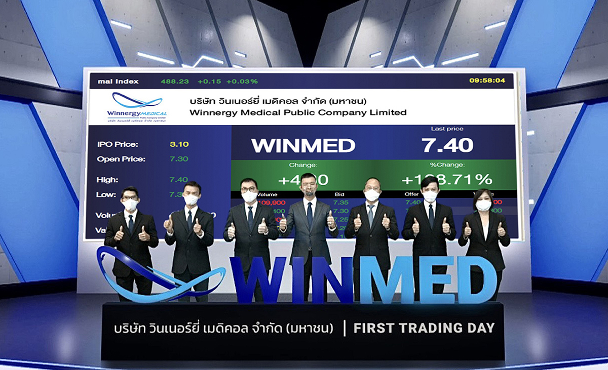 มิติหุ้น – ผศ.ดร.นพ. เทอดศักดิ์ โรจน์สุรกิตติ ประธานคณะกรรมการบริษัท นายนันทิยะ ดารกานนท์ ประธานเจ้าหน้าที่บริหาร บริษัท วินเนอร์ยี่ เมดิคอล จำกัด (มหาชน) “WINMED” ร่วมด้วย ดร.ภากร ปีตธวัชชัย กรรมการและผู้จัดการ ตลาดหลักทรัพย์แห่งประเทศไทย นายแมนพงศ์ เสนาณรงค์ รองผู้จัดการ หัวหน้าสายงานผู้ออกหลักทรัพย์ตลาดหลักทรัพย์แห่งประเทศไทย นายประพันธ์ เจริญประวัติ ผู้จัดการ ตลาดหลักทรัพย์ เอ็ม เอ ไอ พร้อมด้วย ดร.สมภพ ศักดิ์พันธ์พนม ประธานกรรมการ นายสมศักดิ์ ศิริชัยนฤมิตร ประธานเจ้าหน้าที่บริหาร บริษัท แอสเซท โปร แมเนจเม้นท์ จำกัด (APM) ที่ปรึกษาทางการเงิน และนายสมภพ กีระสุนทรพงษ์ กรรมการผู้อำนวยการ บริษัทหลักทรัพย์ ฟินันเซีย ไซรัส จำกัด (มหาชน) (FSS) ผู้จัดจำหน่ายและรับประกันการจำหน่ายหุ้นสามัญเพิ่มทุน ร่วมพิธีเปิด “การซื้อขายหลักทรัพย์วันแรกในตลาดหลักทรัพย์ เอ็ม เอ ไอ (mai)” บริษัท วินเนอร์ยี่ เมดิคอล จำกัด (มหาชน) โดยมีราคาเปิดที่ 7.20 บาท บวก 132.26% จากราคา 3.10 บาท ผ่านระบบออนไลน์ช่องทาง