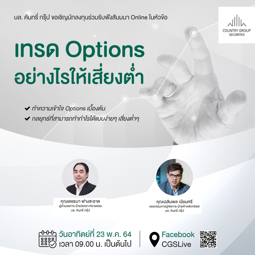 Information บล.คันทรี่ กรุ๊ป” จัดสัมมนาออนไลน์ “เทรด Options อย่างไรให้เสี่ยงต่ำ 11 พฤษภาคม 2021 / เวลา 14:54 น. 91 มิติหุ้น – บริษัท หลักทรัพย์คันทรี่ กรุ๊ป จำกัด (มหาชน) หรือ CGS จัดงานสัมมนาออนไลน์อย่างต่อเนื่อง ในวันอาทิตย์ที่ 23 พ.ค. 64 เวลา 9.00 น. นี้จะมาพูดคุยในหัวข้อ “เทรด Options อย่างไรให้เสี่ยงต่ำ” โดย 2 วิทยาการคนเก่งของบริษัท คุณเดชธนา ฟางสะอาด (คุณบี) ผู้อำนวยการฝ่ายวิเคราะห์รายย่อย และคุณเฉลิมพล เนียมศรี รองกรรมการผู้จัดการ ฝ่ายค้าหลักทรัพย์ ที่จะมาสร้างความเข้าใจ Options เบื้องต้น และกลยุทธ์ที่สามารถทำกำไรได้แบบง่ายๆ เสี่ยงต่ำๆ www.mitihoon.com