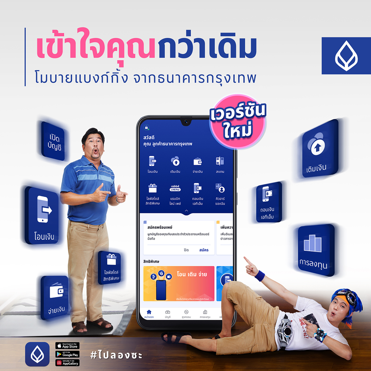สำหรับเรื่องราวในคลิปวิดีโอจะสะท้อนถึงภาพลักษณ์ที่เปลี่ยนไปของธนาคาร ที่สามารถเข้าถึงได้ง่ายขึ้น และมีความเข้าใจลูกค้ามากกว่าที่คิด โดยใช้ภาษาและวิธีการเล่าเรื่องในสไตล์สนุกสนานพร้อมแทรกมุกตลก ซึ่งตรงกับความชื่นชอบของคนไทยโดยเฉพาะกลุ่มคนรุ่นใหม่ ช่วยให้เกิดการเปิดใจรับแบรนด์ และเพิ่มโอกาสสร้าง Brand Engagement ได้มากขึ้นจากการแชร์คอนเทนต์เมื่อชื่นชอบ โดยได้จัดทำคลิปวิดีโอรวมทั้งสิ้น 6 คลิป แบ่งเป็น Feature VDO ซึ่งเป็นคลิปสั้นๆ จำนวน 5 เรื่อง เน้นสร้างการรับรู้และจดจำฟีเจอร์ต่างๆ ที่มีอยู่ในโมบายแบงก์กิ้ง จากธนาคารกรุงเทพ ไม่ว่าจะเป็น ถอน-โอน, เติม-จ่าย, การลงทุน, การแลกรีวอร์ด และการเปิดบัญชีออนไลน์ ส่วนอีก 1 เรื่อง คือ Hero VDO ภายใต้คอนเซ็ปต์ ‘เหมือนเดิมแต่ไม่เหมือนเดิม เพราะเข้าใจคุณมากกว่าเดิม’ เพื่อตอกย้ำคอนเซ็ปต์และ Key Message ที่ต้องการสื่อสาร รวมทั้งกระตุ้นให้เกิดการใช้งานจริงได้มากขึ้นจาก #ไปลองซะ ที่มีอยู่ในช่วงท้ายคลิปวิดีโอ โดยจะเลือกโฟกัสกลุ่มเป้าหมายที่ต้องการเข้าถึงโดยเฉพาะหรือTargetedMarketing ควบคู่ไปกับการสื่อสารผ่านสื่อทั้ง Online และ Offline Marketing อาทิ Out of Home ในพื้นที่กลยุทธ์ที่เข้าถึงผู้บริโภคได้ในวงกว้าง เพื่อให้การสื่อสารเกิดประสิทธิภาพอย่างสูงสุด