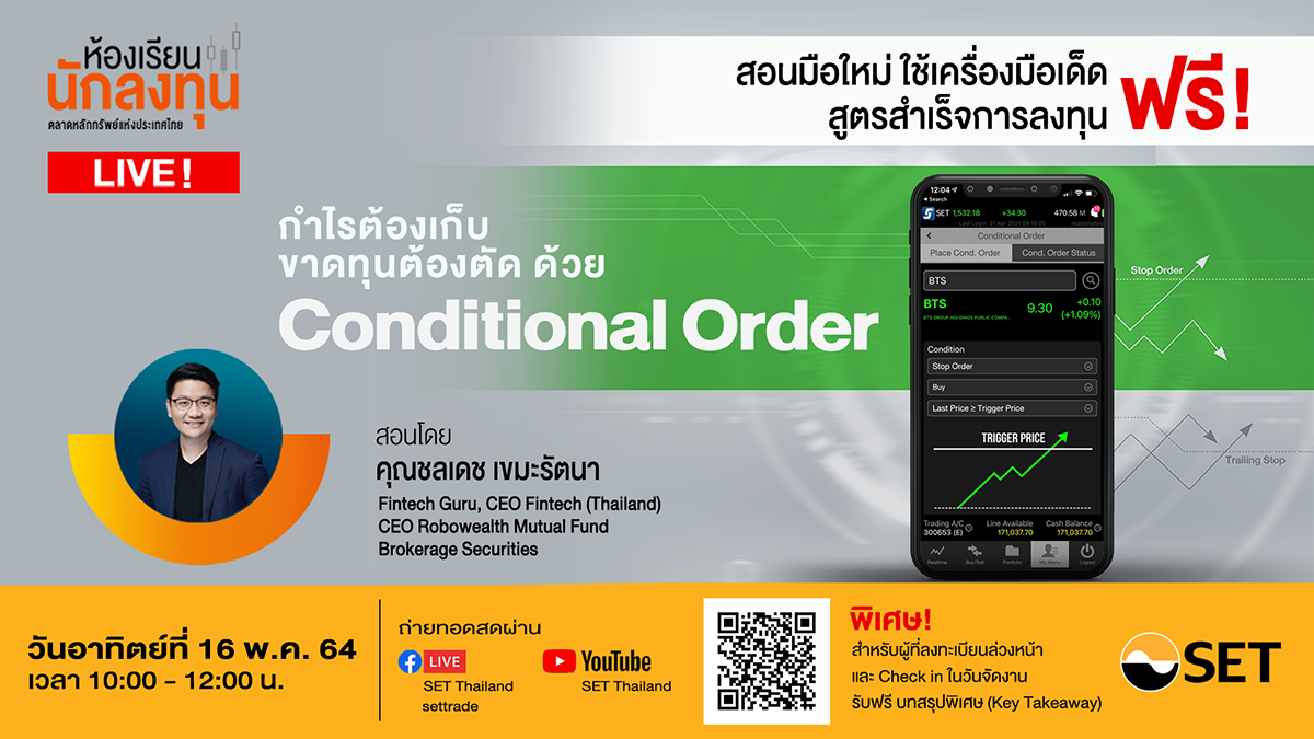 มิติหุ้น – ตลาดหลักทรัพย์แห่งประเทศไทย ชวนผู้ลงทุนมือใหม่รับชมห้องเรียนนักลงทุน Live! เดือนพฤษภาคมนี้ พบหัวข้อ “กำไรต้องเก็บ ขาดทุนต้องตัด ด้วย Conditional Order” เรียนรู้แนวคิดและขั้นตอนการบริหารจัดการเงินลงทุน หรือ Money Management และการใช้โปรแกรมส่งคำสั่งซื้อขายแบบมีเงื่อนไข โดยไม่ต้องเฝ้าหน้าจอ วิทยากรโดย ชลเดช เขมะรัตนา CEO Fintech (Thailand) และ Robowealth Mutual Fund Brokerage Securities ในวันอาทิตย์ที่ 16 พ.ค. 2564 เวลา 10.00–12.00 น. รับชมผ่าน Facebook Live และ YouTube “SET Thailand” พิเศษ! ผู้ที่ลงทะเบียนล่วงหน้า พร้อมชมสัมมนาและ Check in ในวันงาน รับบทสรุปพิเศษ (Key Takeaway) ลงทะเบียนล่วงหน้าได้ที่ www.setinvestnow.com