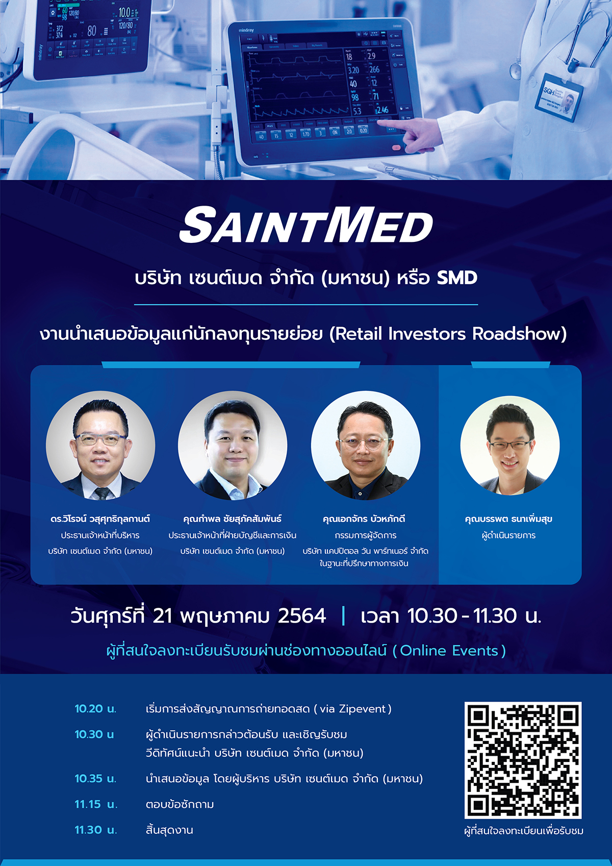 มิติหุ้น – ถือเป็นหุ้น IPO น้องใหม่ในอุตสาหกรรมเครื่องมือแพทย์เฉพาะทาง สำหรับ ‘บมจ. เซนต์เมด หรือ SMD’ ที่กำลังเตรียมตัวเข้าระดมทุนในตลาดหลักทรัพย์ เอ็ม เอ ไอ ในเร็วๆ นี้ ชูจุดเด่นการเป็นผู้นำการจัดจำหน่ายผลิตภัณฑ์ทางการแพทย์เฉพาะทางด้านระบบการหายใจและช่วยชีวิต ด้วยนวัตกรรมและเทคโนโลยีที่ทันสมัย สามารถดูแลคนไทยให้ปลอดภัยและมีสุขภาพที่ดี รองรับการเปลี่ยนแปลงวิถีชีวิตเข้าสู่สังคมผู้สูงอายุและสังคมแห่งการดูแลสุขภาพ ล่าสุด ผู้บริหาร SMD ‘ดร.วิโรจน์ วสุศุทธิกุลกานต์’ และ ‘กำพล ชัยสุภัคสัมพันธ์’ พร้อมด้วย