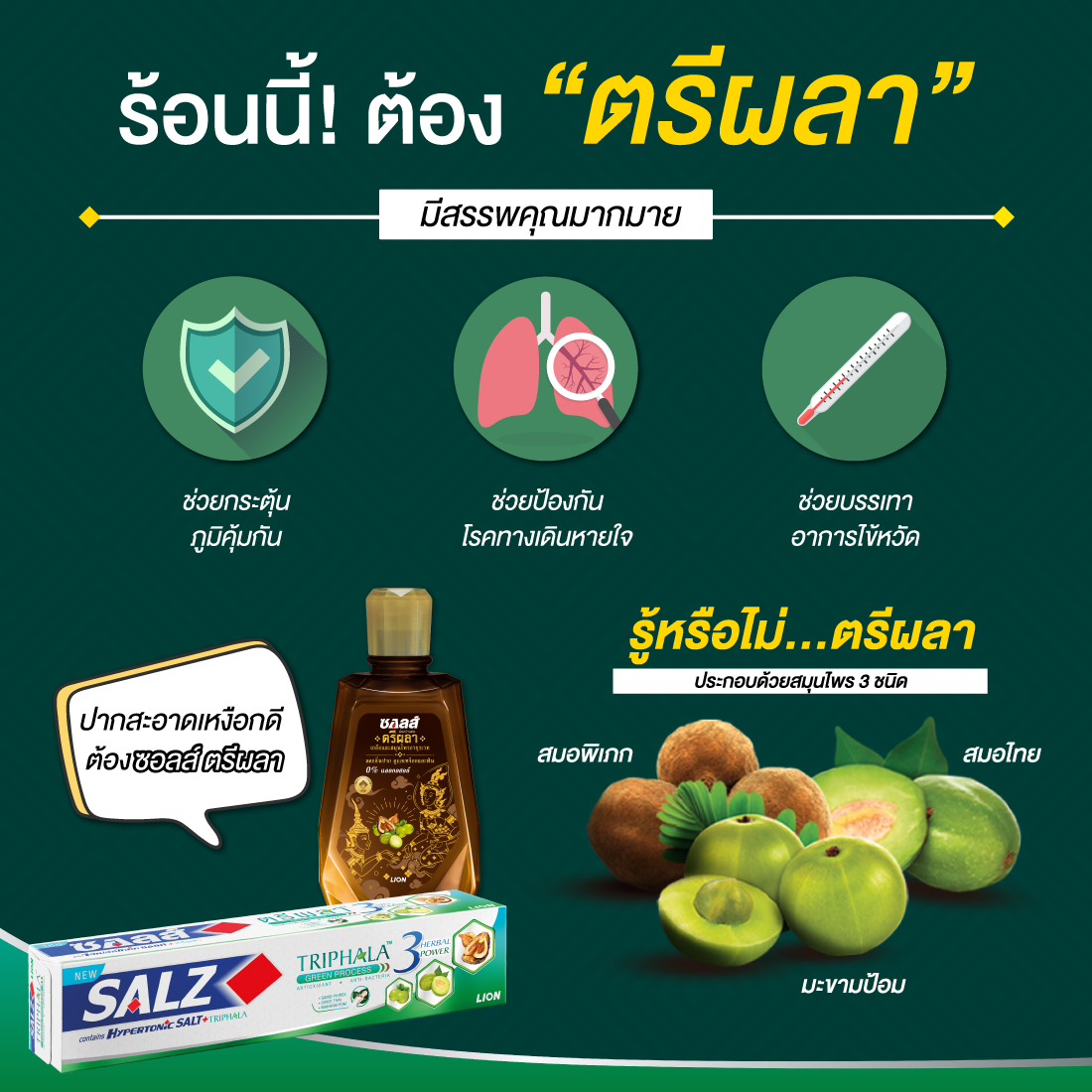 “ชูชีพ อภิรักษ์” ผู้จัดการส่วนวิจัยและพัฒนาผลิตภัณฑ์ บริษัท ไลอ้อน (ประเทศไทย) จำกัด ในฐานะภาคเอกชนที่ให้ความสำคัญกับการนำสมุนไพรไทยมาเป็นส่วนผสมของผลิตภัณฑ์ กล่าวว่า บริษัทฯ ให้ความสำคัญกับการพัฒนานวัตกรรมให้กับผลิตภัณฑ์อย่างต่อเนื่อง และได้มีการตั้งศูนย์วิจัยและพัฒนานวัตกรรมของตนเองที่อุทยานวิทยาศาสตร์แห่งประเทศไทย บริษัทฯ พบว่าตรีผลาอยู่ในบัญชียาหลักแห่งชาติ และอยู่ในตำรับอายุรเวท มีคุณสมบัติต้านแบคทีเรีย จึงได้นำมาวิจัยในห้องทดสอบของบริษัท และต่อมาได้นำมาวิจัยในเชิงลึกร่วมกับ วว. โดยทำการทดสอบในระดับเนื้อเยื่อผิวหนังจำลอง 3 มิติ (3D Skin) จนได้สารสกัดที่สามารถต้านแบคทีเรียได้ภายใน 1 นาที จึงนำมาเป็นส่วนผสมในผลิตภัณฑ์ต่าง ๆ ของ SALZ ได้แก่ ยาสีฟัน และน้ำยาบ้วนปาก ซึ่งคุณสมบัติที่พิเศษนี้ทำให้ SALZ ได้รับรางวัล Gold Prize จาก Seoul International Invention Fair 2018 หรืองานประกวดและจัดแสดงสิ่งประดิษฐ์นานาชาติ ในหมวดของเครื่องสำอางและผลิตภัณฑ์ทางการแพทย์ ซึ่งจัดขึ้นที่กรุงโซล ประเทศเกาหลีใต้