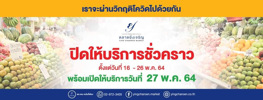 ตลาดยิ่งเจริญ คำนึงถึงความปลอดภัย สวัสดิภาพ ของผู้บริโภค และเพื่อเป็นการลดความเสี่ยงตามหลักการสาธารณสุข จึงพิจารณาเห็นควรขยายเวลาปิดให้บริการชั่วคราว เพิ่มอีก 3 วัน และจะเปิดให้บริการตามปกติ ในวันพฤหัสบดีที่ 27 พฤษภาคม 2564