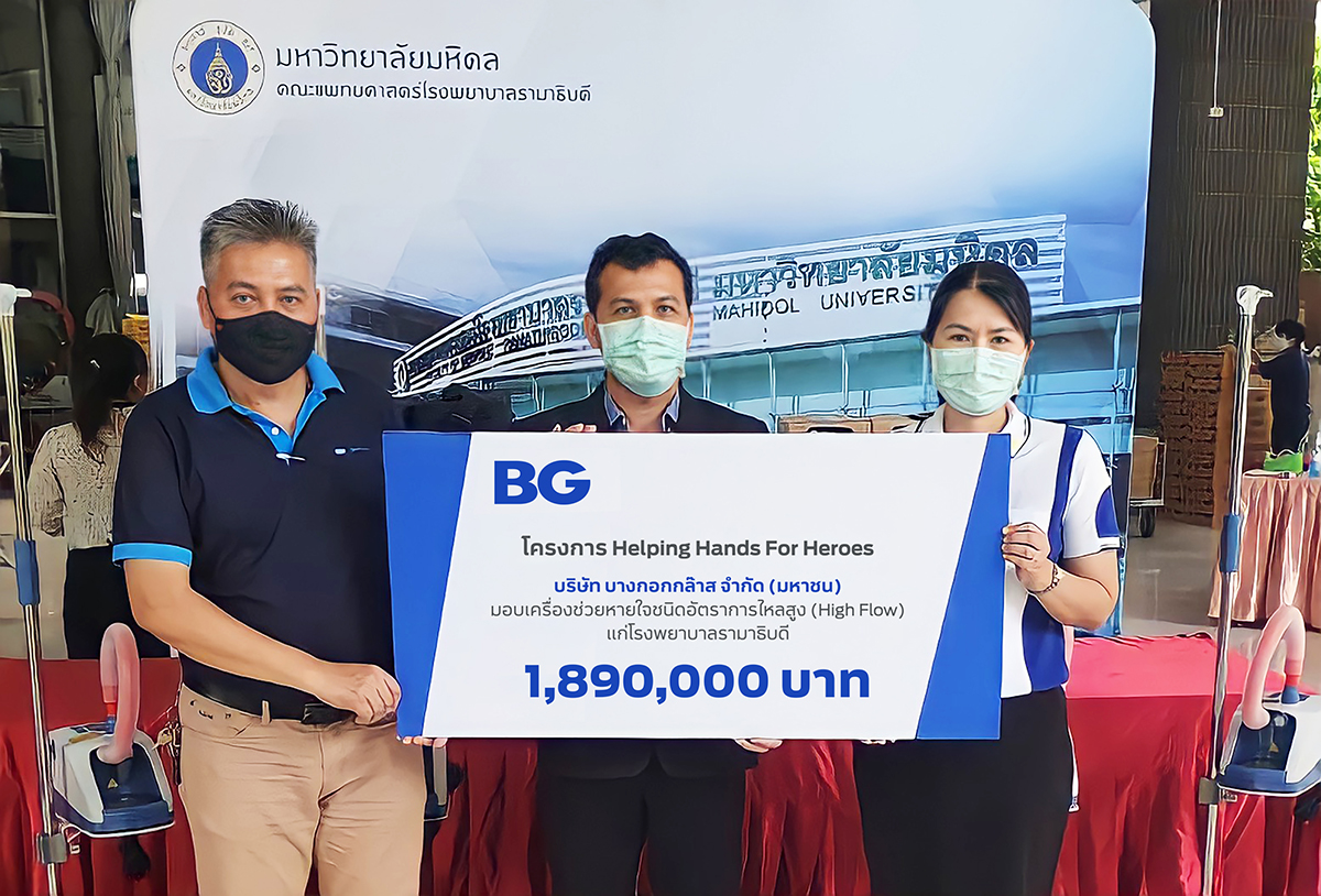 มิติหุ้น – เมื่อวันที่ 24 พฤษภาคม 2564 บริษัท บางกอกกล๊าส จำกัด (มหาชน) หรือ บีจี (BG) และบริษัทในเครือ สานต่อโครงการ “Helping Hands For Heroes” เดินหน้าช่วยเหลือประเทศไทยพ้นวิกฤติโควิด-19 อย่างต่อเนื่อง ผ่านการมอบเครื่องช่วยหายใจชนิดอัตราการไหลสูง (High Flow) เพื่อใช้ในการรักษาผู้ป่วยโควิด – 19 รวมมูลค่า 1,890,000 บาท ให้แก่โรงพยาบาลรามาธิบดี โดยมี นายวสันต์ ทิมา หัวหน้างานอุปกรณ์การแพทย์ และนางอุษา ใจหนัก ผู้ตรวจการงานการพยาบาลบริการเฉพาะ ฝ่ายการพยาบาล โรงพยาบาลรามาธิบดี เป็นผู้รับมอบ ณ ชั้น 1 อาคารบริหารคณะแพทยศาสตร์โรงพยาบาลรามาธิบดี