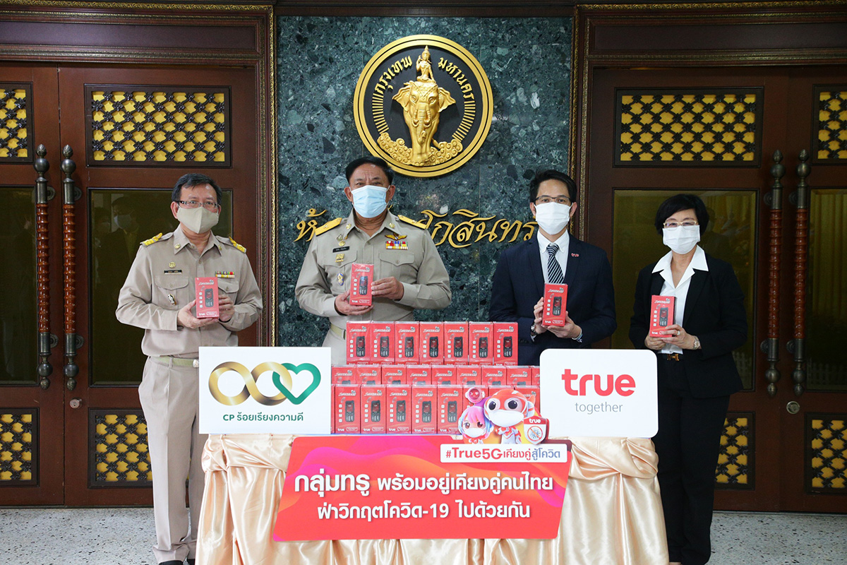 อสารจากกลุ่มทรู โดยดร.ธีรเดช ดำรงค์พลาสิทธิ์ (ที่ 2 จากขวา) กรรมการผู้จัดการใหญ่ (ร่วม) บมจ. ทรู คอร์ปอเรชั่น ซึ่งประกอบด้วย True SuperTalkie 4G (Walkie Talkie) พร้อมซิมทรูมูฟ เอช แพ็กเกจโทรฟรีทุกเครือข่าย อินเทอร์เน็ตไม่อั้น ความเร็ว 10 Mbps. ใช้งานได้นาน 12 เดือน จำนวน 50 ชุด ให้บุคลากรทางการแพทย์ รวมถึงเจ้าหน้าที่ของศูนย์