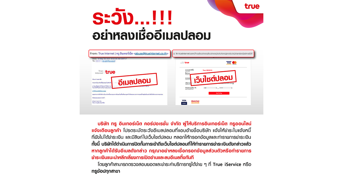 มิติหุ้น – บริษัท ทรู อินเทอร์เน็ต คอร์ปอเรชั่น จำกัด ผู้ให้บริการอินเทอร์เน็ต ทรูออนไลน์ แจ้งเตือนลูกค้า โปรดระมัดระวังอีเมลปลอมที่แอบอ้างชื่อบริษัท แจ้งให้ชำระใบแจ้งหนี้ที่ยังไม่ได้ชำระเงิน และมีลิงก์ไปเว็บไซต์ปลอม หลอกให้กรอกข้อมูลและทำรายการชำระเงิน ทั้งนี้ บริษัทได้ดำเนินการปิดกั้นการเข้าถึงเว็บไซต์ปลอมที่ให้ทำรายการชำระเงินดังกล่าวแล้ว หากลูกค้าได้รับอีเมลดังกล่าว กรุณาอย่าหลงเชื่อกรอกข้อมูลส่วนตัวหรือทำรายการชำระเงิน แนะนำหลีกเลี่ยงการเปิดอ่านและลบอีเมลทิ้งทันที โดยลูกค้าสามารถตรวจสอบยอดและชำระค่าบริการทรูได้ง่าย ๆ ที่ True iService หรือ ทรูช้อปทุกสาขา