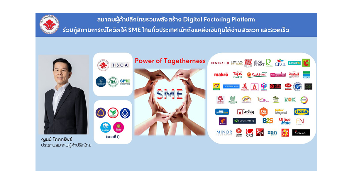มิติหุ้น – นายญนน์ โภคทรัพย์ ประธานสมาคมผู้ค้าปลีกไทย เปิดเผยว่า วันนี้ (27 พ.ค. 64) ทางสมาคมผู้ค้าปลีกไทย ได้มีการประชุมกับสมาชิกสมาคมและภาคีเครือข่ายกว่า 70 บริษัท ซึ่งมีผู้ประกอบการ SME ที่อยู่ในห่วงโซ่การค้ามากกว่า 100,000 ราย นับเป็น 40% ของมูลค่าการบริโภคค้าปลีกทั้งประเทศ หรือ คิดเป็น 12% ของ GDP ร่วมกับธนาคารพาณิชย์รายใหญ่ 5 รายในเฟสแรก คือ ธนาคารกสิกรไทย ธนาคารไทยพาณิชย์ ธนาคารกรุงเทพ ธนาคารกรุงไทย และธนาคารออมสิน เพื่อเชื่อมโยงให้ผู้ประกอบการ SME สามารถเข้าถึง แหล่งเงินทุน (Soft Loan) ผ่าน Digital Factoring Platform โดยสมาคมผู้ค้าปลีกไทย เป็นศูนย์กลางเชื่อมต่อข้อมูลของผู้ผลิต ผู้จัดจำหน่าย เพื่อช่วยให้การพิจารณาสินเชื่อ แก่ผู้ประกอบการ SME และเกษตรกร ได้ง่าย สะดวกและรวดเร็ว โดยเฉพาะในสภาวะวิกฤติ โควิด-19 ที่ SME ทั่วประเทศ ขาดสภาพคล่องเป็นอย่างมาก และต้องการความช่วยเหลือ อย่างเร่งด่วน