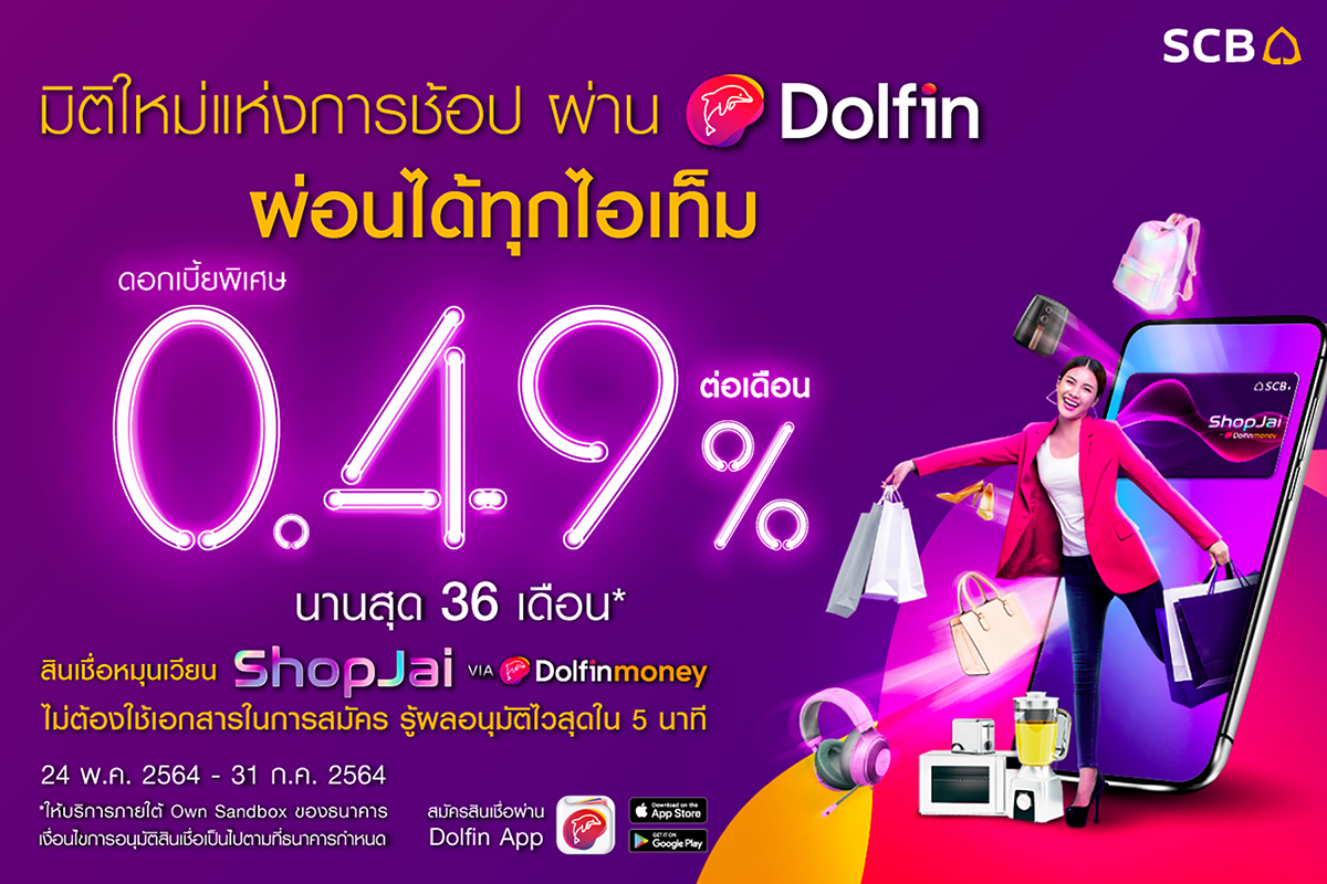 เคชัน SCB EASY ได้ทันที และเพื่อเป็นการกระตุ้นให้เกิดการใช้งาน ธนาคารจึงได้จัดแคมเปญส่งเสริมการตลาดสำหรับลูกค้าที่สมัครใช้บริการสินเชื่อหมุนเวียน “ShopJai ผ่าน Dolfin Money” และได้รับอนุมัติและใช้วงเงินตั้งแต่วันที่ 24 พฤษภาคม 2564 ถึง 31 กรกฎาคม 2564 รับดอกเบี้ยพิเศษ 0.49% ต่อเดือน เทียบเท่าอัตราดอกเบี้ยลดต้นลดดอก 10.68% ต่อปี (Effective rate) ผ่อนชำระรายงวดนานสูงสุด 36 เดือน ตั้งเป้าภายในปี 2564 จะมีผู้สมัครใช้บริการสินเชื่อหมุนเวียน “ShopJai ผ่าน Dolfin Money” กว่า 20,000 ราย ทั้งนี้ ธนาคารมีแผนที่จะร่วมมือกับองค์กรชั้นนำอื่น ๆ เพื่อร่วมกันสร้างระบบนิเวศน์ด้านดิจิทัลไลฟ์สไตล์ที่ตอบโจทย์และครอบคลุมทุกความต้องการของลูกค้า และเพื่อขยายขอบเขตการเข้าถึงบริการทางการเงินให้กับคนไทยได้มากยิ่งขึ้นในอนาคต”