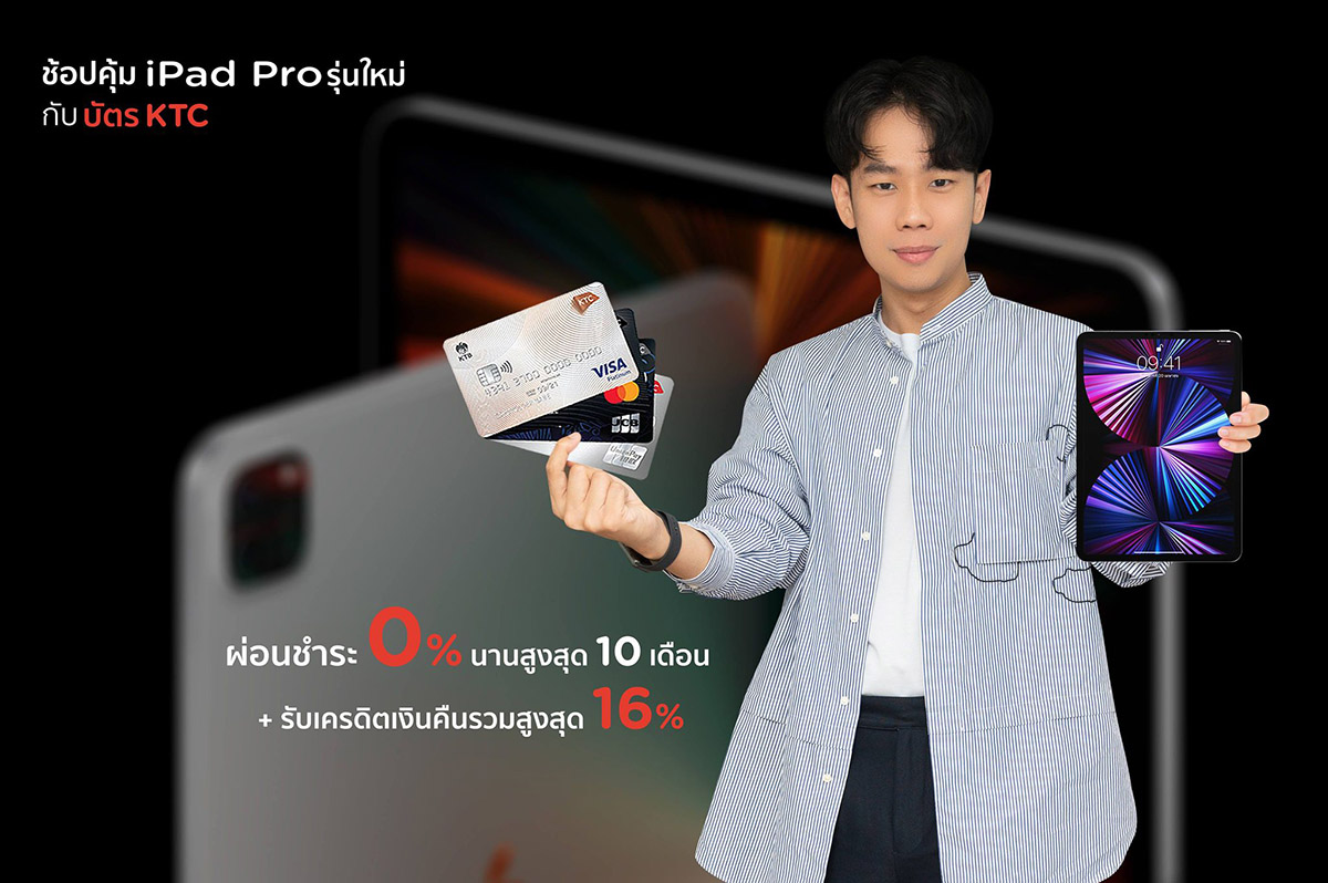 มิติหุ้น – “เคทีซี” หรือ บริษัท บัตรกรุงไทย จำกัด (มหาชน) มอบสิทธิพิเศษสำหรับสมาชิกบัตรเครดิตเคทีซี ผ่อนชำระ iPad Pro รุ่นใหม่ล่าสุด 0% นานสูงสุด 10 เดือน หรือเลือกผ่อนชำระนานสูงสุด 20 เดือน ด้วยอัตราดอกเบี้ยพิเศษ 0.59% สำหรับบัตรกดเงินสด “เคทีซี พราว” พร้อมรับเครดิตเงินคืนรวมสูงสุด 16% โดยสามารถซื้อสินค้าได้ที่ร้านค้าไอทีชั้นนำ อาทิ Studio7 / iStudio / Apple Store / AIS / DTAC / TRUE / Jaymart / Telewiz / BANANA หรือช่องทางออนไลน์ www.apple.com/th/shop / www.store.ais.co.th / www.dtaconline.dtac.co.th / ตั้งแต่วันที่ 19 พฤษภาคม 2564 – 31 กรกฎาคม 2564