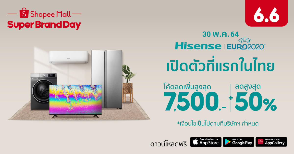 ในแคมเปญ Shopee 6.6 Greatest Brands Celebration นี้ ห้ามพลาด!! กับโปรโมชั่นเด็ด เผ็ดทุกองศาร้อน ในวันที่ 30 พฤษภาคม 2564 กับแคมเปญ Hisense x Shopee Super Brand Day ที่เตรียมขนทัพสินค้าใหม่สุดล้ำสมัยกว่า 20 รุ่น มาพร้อมเปิดตัวให้ได้เป็นเจ้าของก่อนใครบนช้อปปี้ ที่เดียว!