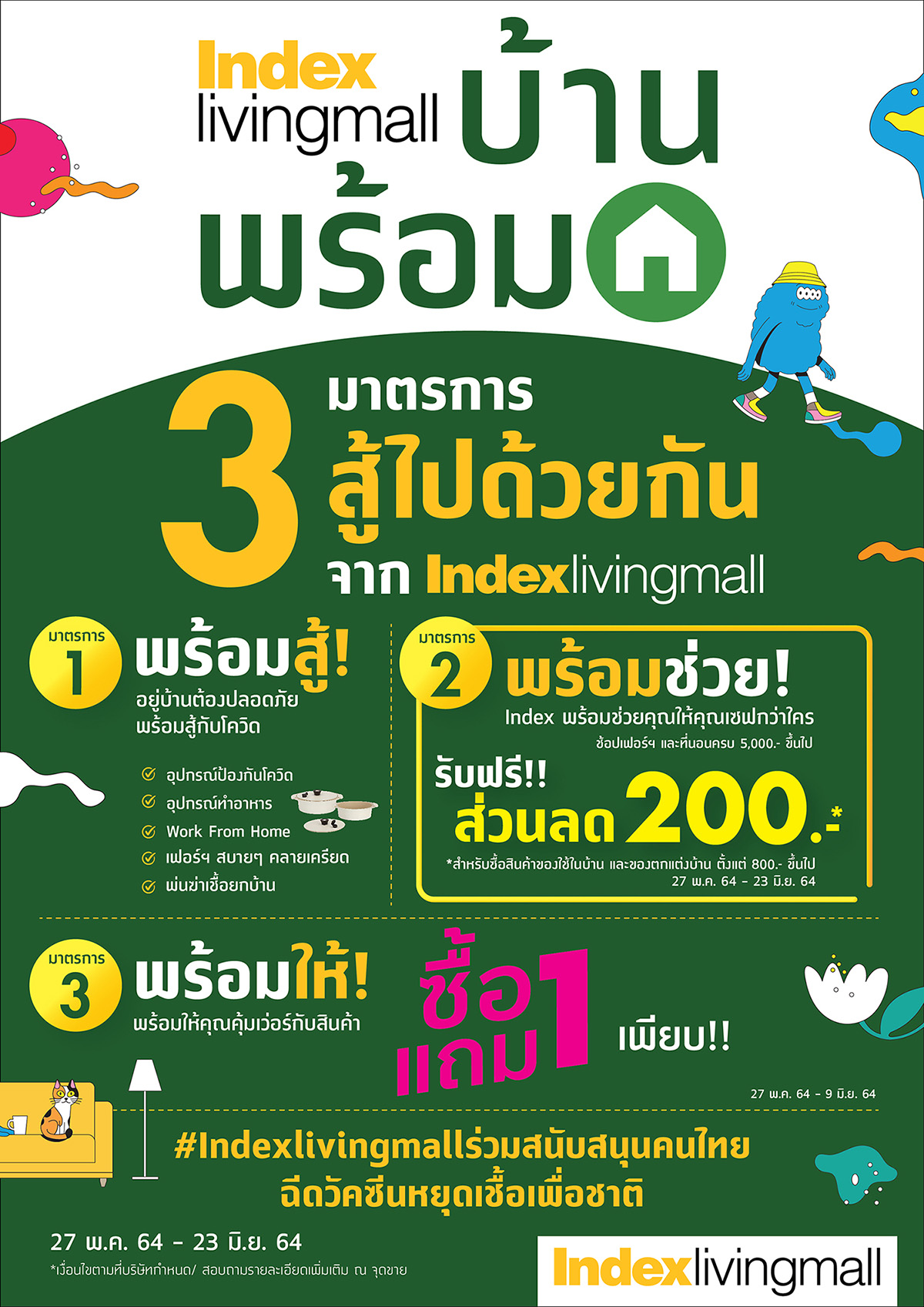อินเด็กซ์ ลิฟวิ่งมอลล์ เข้าใจถึงพฤติกรรมของลูกค้าและความรู้สึกคนไทย จึงสนับสนุนให้ทุกคนตั้งรับอย่าง ไม่ประมาทและเตรียมพร้อมในทุกด้าน เพื่อให้ผ่านช่วงเวลาที่ยากลำบากไปด้วยกัน ล่าสุดเปิดแคมเปญ “บ้านพร้อม” #สู้ไปด้วยกัน Index Living Mall ชูไฮไลท์ 3มาตรการให้พร้อมตั้งการ์ดรับ Covid-19 อย่างปลอดภัยทุกมิติตั้งแต่อยู่บ้าน ด้วย มาตรการที่ 1 “พร้อมสู้!” เตรียมเช็กลิสต์ความพร้อมในทุกมุมบ้าน รับมือการดูแลสุขภาพและรองรับไลฟ์สไตล์อยู่บ้านอย่างมีความสุขกับ 4 กลุ่มสินค้า ได้แก่ 1.กลุ่มสินค้าป้องกัน Covid-19 เพื่อทำความสะอาดทุกมุมโปรดของสมาชิกภายในบ้านให้ปลอดเชื้อ ประกอบด้วยอุปกรณ์ทำความสะอาดต่างๆ, ทิชชู, แอลกอฮอล์ และหน้ากากอนามัย ฯลฯ