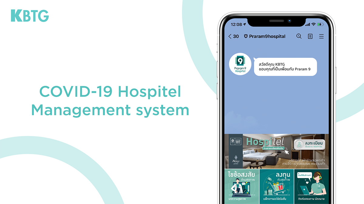 ด้าน นายเรืองโรจน์ พูนผล ประธาน กสิกร บิซิเนส-เทคโนโลยี กรุ๊ป (KBTG) เปิดเผยว่า KBTG ได้ริเริ่มทําระบบ COVID-19 Hospitel Management Solution ระบบบริหารจัดการผู้ป่วยโควิด-19 สําหรับ สถานพยาบาลให้กับทางโรงพยาบาลพระรามเก้า ซึ่งเป็นโรงพยาบาลแห่งแรกที่นําระบบนี้มาใช้ เพื่อรองรับกลุ่ม ผู้ป่วยโควิดที่ได้รับการตรวจแล้วพบติดเชื้อโควิด-19 (กลุ่มสีเขียว) แต่ไม่มีอาการหรือมีอาการเล็กน้อย
