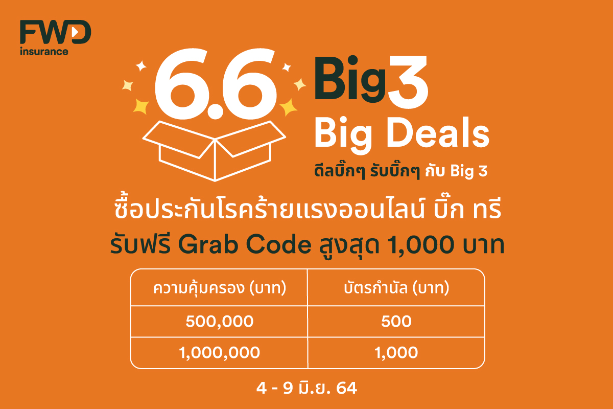 มิติหุ้น – บริษัท เอฟดับบลิวดี จำกัด (มหาชน) (FWD ประกันชีวิต) สนับสนุนให้ทุกคน ‘Celebrate living’ ใช้ชีวิตเต็มที่ ตามรูปแบบที่ทุกคนต้องการ ด้วยผลิตภัณฑ์ความคุ้มครองที่สมัครได้ง่ายๆ พร้อมข้อเสนอ Flash Sale สุดพิเศษ ‘6.6 Big 3, Big Deals ดีลบิ๊กๆ รับบิ๊กๆ รับโค้ด Grab สูงสุด 1,000 บาท เมื่อซื้อผลิตภัณฑ์ FWD ประกันชีวิตที่ร่วมรายการ ผ่านช่องทางออนไลน์ ตั้งแต่วันที่ 4-9 มิ.ย.64 คลิก https://fwdth.co/Big366แม้อยู่ที่บ้านคุณก็สามารถรับความคุ้มครองได้อย่างสะดวกสบาย ผ่านแพลตฟอร์ม iFWD ให้คุณได้รับความคุ้มครองทันทีภายใน 5 นาที โดยตอบคำถามสุขภาพแค่ไม่กี่ข้อ