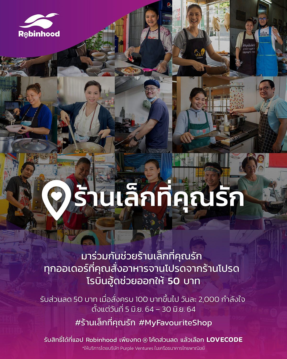นายธนา เธียรอัจฉริยะ ประธานกรรมการ บริษัท เพอร์เพิล เวนเจอร์ส จำกัด ผู้พัฒนาและให้บริการ “โรบินฮู้ด” แพลตฟอร์มฟู้ดเดลิเวอรี กล่าวว่า “ความยืดเยื้อของสถานการณ์โควิดนอกจากสร้างบาดแผลทางเศรษฐกิจให้กับประเทศแล้ว ยังส่งผลกระทบต่อทุกภาคส่วนในสังคม โดยเฉพาะอย่างยิ่งผู้ประกอบการในกลุ่มธุรกิจอาหารที่เปรียบเสมือนกระดูกสันหลังทางเศรษฐกิจของประเทศ และในช่วงเวลาที่ยากลำบากเช่นนี้ “กำลังใจ” เป็นสิ่งสำคัญ ดังนั้น เราจึงได้คิดแคมเปญใหม่ที่เรียกว่า “ร้านเล็กที่คุณรัก” ขึ้นมา โดยมีจุดประสงค์หลักเพื่อชวนลูกค้ากว่า 1 ล้านคนที่อยู่บนแพลตฟอร์มโรบินฮู้ด ได้มีส่วนช่วยเหลือและร่วมส่งกำลังใจให้กับร้านอาหารเล็ก ๆ ไม่ว่าจะเป็นร้านโปรดในดวงใจ ร้านเล็กใกล้บ้านที่คุ้นเคย หรือร้านในความทรงจำที่อยากให้อยู่กับเราไปนาน ๆ เพียงช่วยสั่งอาหารจากร้านที่คุณรัก ครบ 100 บาท โรบินฮู้ดช่วยออกค่าอาหาร 50 บาท เมื่อกดเพิ่มโค้ดส่วนลด “LOVECODE” วันละ 2,000 กำลังใจ เริ่มวันที่ 5 มิถุนายน จนถึงวันที่ 30 มิถุนายน 2564”