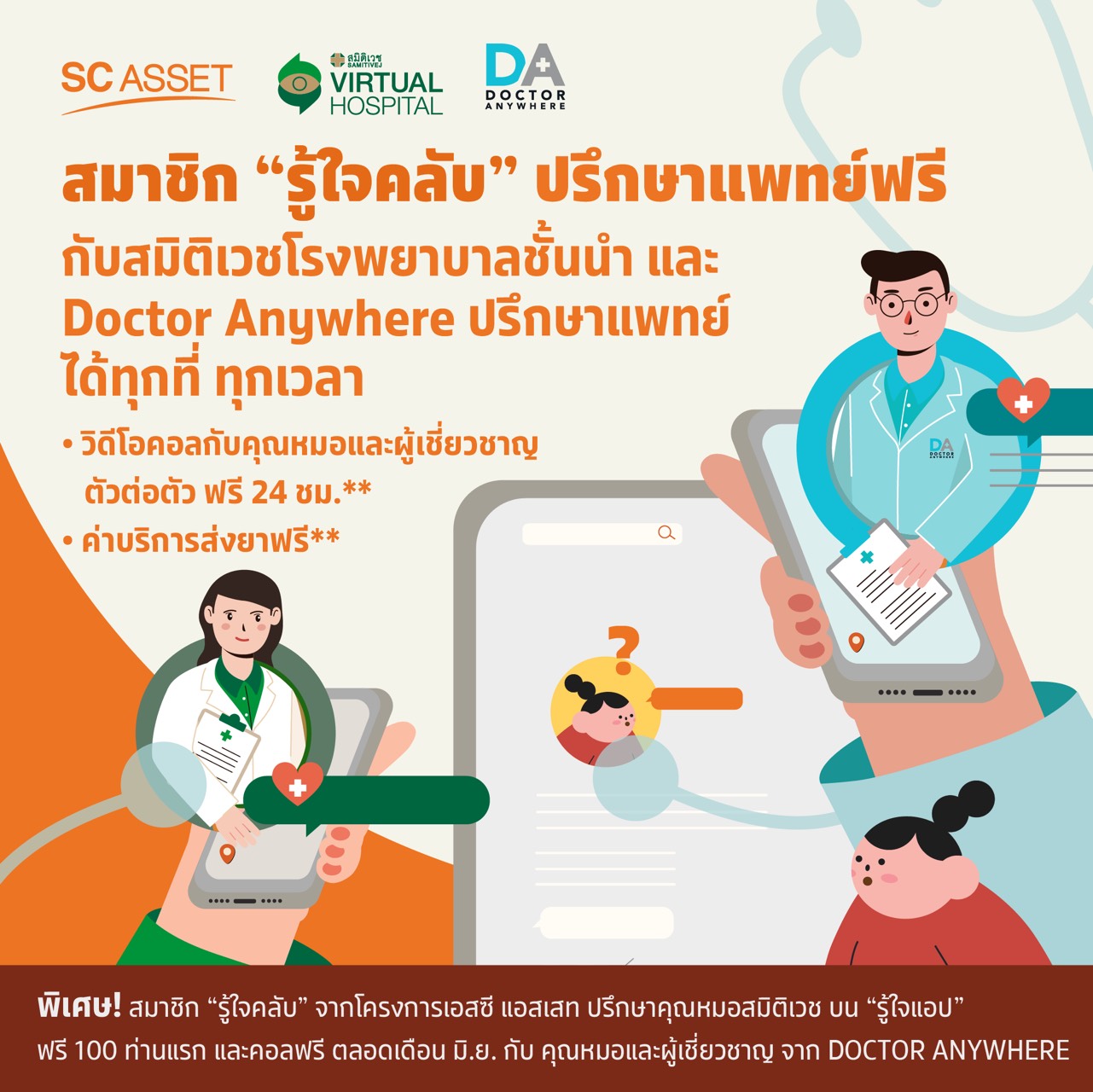 Doctor Anywhere ปรึกษาแพทย์ทั่วไปฟรี 1 ครั้งต่อท่าน โดยไม่กำจัดจำนวนผู้รับสิทธ์ พร้อมส่งยาฟรี ในเขตกรุงเทพฯ ตลอดเดือน มิ.ย.นี้ โดยจะได้รับคำปรึกษาจากแพทย์ผู้เชี่ยวชาญหลากหลายสาขา เช่น แพทย์ทั่วไป แพทย์ด้านความงาม ผู้ให้บริการด้านสุขภาพจิต จากโรงพยาบาล สถานประกอบการ และร้านขายยาในเครือ ซึ่งล้วนเมีความชำนาญและน่าเชื่อถือ