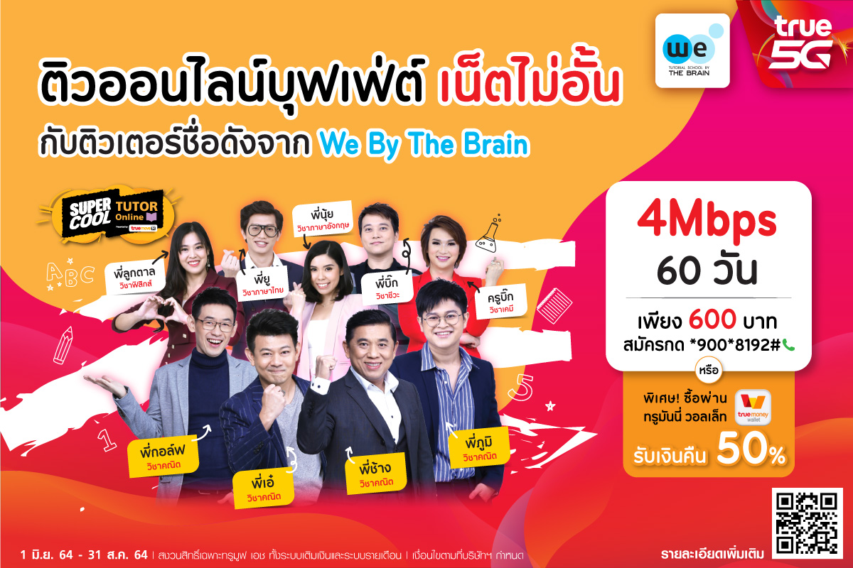มิติหุ้น – ติวเตอร์ออนไลน์ ติวไม่อั้น…. กลุ่มทรู จับมือ สถาบันกวดวิชา วี บาย เดอะ เบรน ส่งแพ็กเกจ “ติวออนไลน์บุฟเฟ่ต์ เน็ตไม่อั้น” กับติวเตอร์ชื่อดัง ผ่านแพลตฟอร์ม “วี-เลิร์น” (VLEARN) ภายใต้ TrueVirtual World (True VWORLD) สุดคุ้มเฉพาะลูกค้าทรูมูฟ เอช รับอินเทอร์เน็ต 4G/3G ความเร็ว 4 Mbps นาน 60 วัน เพียง 600 บาท ได้ทั้งเน็ต และคอร์สเรียนออนไลน์ สมัครง่ายๆเพียงกดรับสิทธิ์ *900*8192# โทรออก พร้อมรับรหัสใช้เป็นส่วนลดสูงสุด 600 บาท สำหรับสมัครคอร์สเรียนออนไลน์ถัดไปที่สถาบันกวดวิชา วี บาย เดอะ เบรน พิเศษยิ่งขึ้นเมื่อจ่ายผ่านทรูมันนี่ วอลเล็ท รับเงินคืน 50% สามารถนำมาซื้อแพ็กเกจเสริมในครั้งถัดไป ยิ่งไปกว่านั้น ยังรับฟรีประกันโควิด-19 นาน 30 วัน คุ้มครองสูงสุด 100,000 บาท อีกด้วย