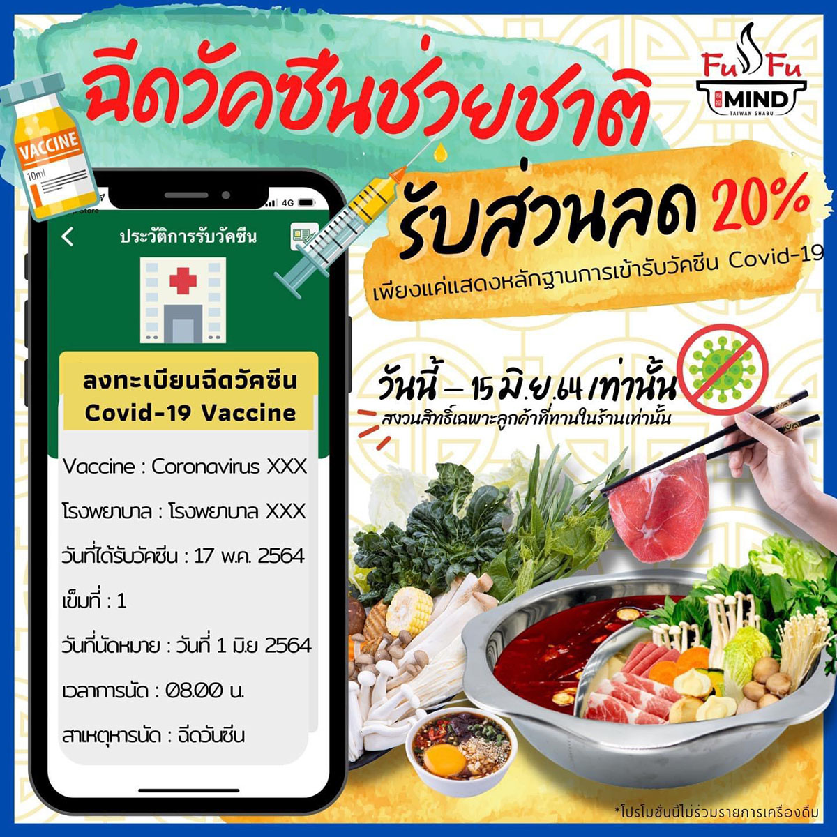 มิติหุ้น – “ฟู่ฟู่ ไต้หวันนิส ชาบู บุฟเฟ่ต์” และ“ฟู่ฟู่ มายด์” (FUFU MIND) ชาบูไต้หวันเจ้าแรกในประเทศไทย ร่วมเป็นส่วนหนึ่งในการสนับสนุนแคมเปญ ฉีดวัคซีน หยุดเชื้อ เพื่อชาติ เชิญชวนให้คนไทยฉีดวัคซีนป้องกัน และ ลดความรุนแรง พร้อมควบคุมการแพร่ระบาดของโควิด-19 เพื่อให้ทุกคนสามารถกลับมาใช้ชีวิตตามปกติได้โดยเร็ว มอบโปรโมชั่นพิเศษส่วนลด 20% ให้กับลูกค้าที่มาใช้บริการ เพียงแสดงหลักฐานการลงทะเบียนฉีดวัคซีนหรือเข้ารับวัคซีนโควิด-19 ที่ร้าน “ฟู่ฟู่ ไต้หวันนิส ชาบู บุฟเฟ่ต์” ทั้ง 5 สาขา ได้แก่ สาขาพระราม4, สาขาอารีย์, สาขาตึกเอ็มไพร์, สาขาตึก G-Tower และสาขาแฟชั่น ไอซ์แลนด์” และร้าน “ฟู่ฟู่ มายด์” ภายในปั๊มเชลล์ สาขาบางใหญ่ ตั้งแต่วันนี้ ถึงวันที่ 15 มิถุนายน 2564 ติดตามรายละเอียดเพิ่มเติมได้ที่