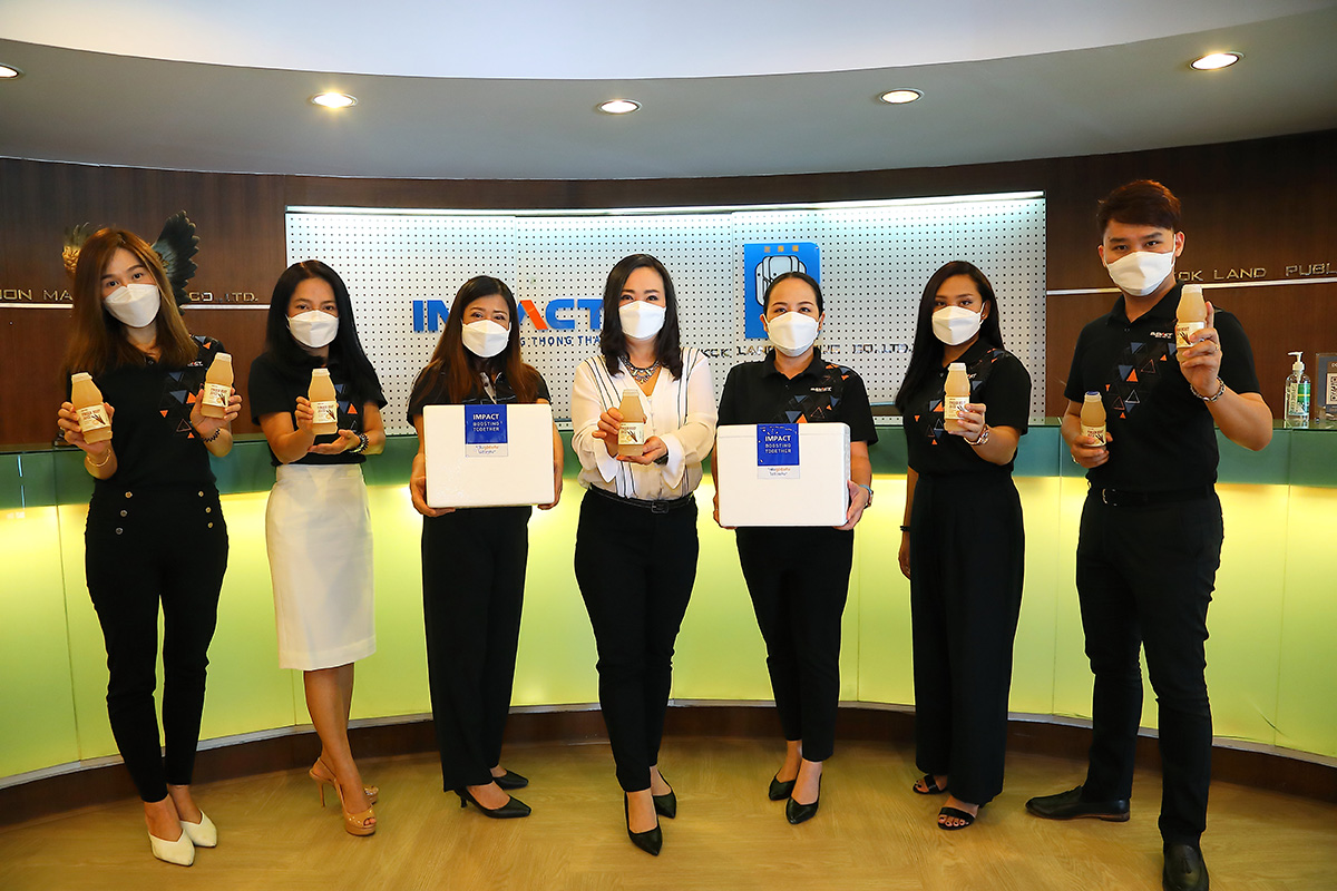 มิติหุ้น – นางอัจฉราวรรณ ศุภางคะรัตน์ (กลาง) ผู้อำนวยการฝ่ายขาย บริษัท อิมแพ็ค เอ็กซิบิชั่น แมเนจเม้นท์ จำกัด ผู้บริหารศูนย์แสดงสินค้าและการประชุม อิมแพ็ค เมืองทองธานี พร้อมทีมพนักงานขาย ร่วมแสดงความห่วงใยไปถึงยังลูกค้ากลุ่มผู้จัดงาน ในสถานการณ์ระบาดของเชื้อไวรัสโควิด-19 ระลอกใหม่ ทำให้ไม่สามารถจัดงานหรือพบเจอกับลูกค้าได้เช่นปกติ ขอส่งมอบน้ำสมุนไพรกระชายอินทรีย์เพิ่มภูมิคุ้มกันโรคให้กับลูกค้ารวมกว่า 160 หน่วยงาน จำนวน 1,800 ขวด จากสรรพคุณทางยาที่จะช่วยดูแลสุขภาพให้ดีแล้ว น้ำกระชายอินทรีย์ของ อิมแพ็ค ยังรสชาติดี ดื่มง่าย แม้เป็นสมุนไพรวัตถุดิบกระชายและขิง ปลูกตามหลักเกษตรอินทรีย์ ปรุงโดยปราศจากวัตถุกันเสีย ไม่แต่งสีและกลิ่น เป็นเครื่องดื่มเพื่อสุขภาพพร้อมมอบให้ลูกค้าคนสำคัญ