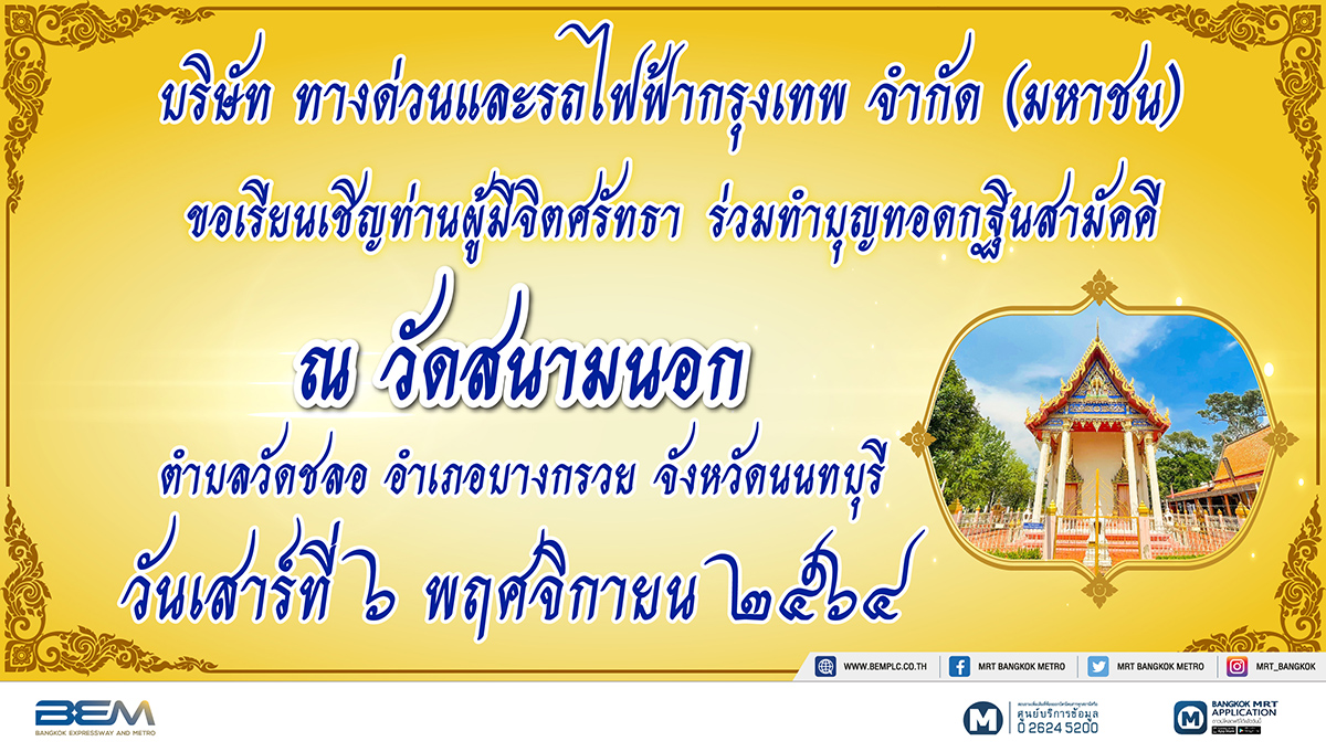 มิติหุ้น – บริษัท ทางด่วนและรถไฟฟ้ากรุงเทพ จำกัด (มหาชน) (BEM) ขอเชิญชวนท่านผู้มีจิตศรัทธา ร่วมทำบุญทอดกฐินสามัคคีประจำปี 2564 ณ วัดสนามนอก อำเภอบางกรวย จังหวัดนนทบุรี ซึ่งอยู่ใกล้กับรถไฟฟ้า MRT สถานีสิรินธร สายสีน้ำเงิน และด่านเก็บค่าผ่านทางพิเศษ บางบำหรุ เพื่อสมทบทุนบูรณะเสนาสนะของพระภิกษุ สามเณร และทำนุบำรุงพระพุทธศาสนา ในวันเสาร์ที่ 6 พฤศจิกายน 2564 ทั้งนี้ ผู้มีจิตศรัทธาสามารถร่วมทำบุญตามกำลังศรัทธาได้ที่สถานีรถไฟฟ้า MRT สายสีน้ำเงินและสายสีม่วงทุกสถานี ตั้งแต่วันนี้ – 27 ตุลาคม 2564 ขออานิสงส์การกฐินและอานุภาพแห่งคุณพระศรีรัตนตรัย โปรดดลบันดาลให้ทุกท่านประสบแต่ความสุข ความเจริญรุ่งเรือง ด้วยอายุ วรรณะ สุขะ พละ ปฏิภาณ ธนสารสมบัติทุกประการ